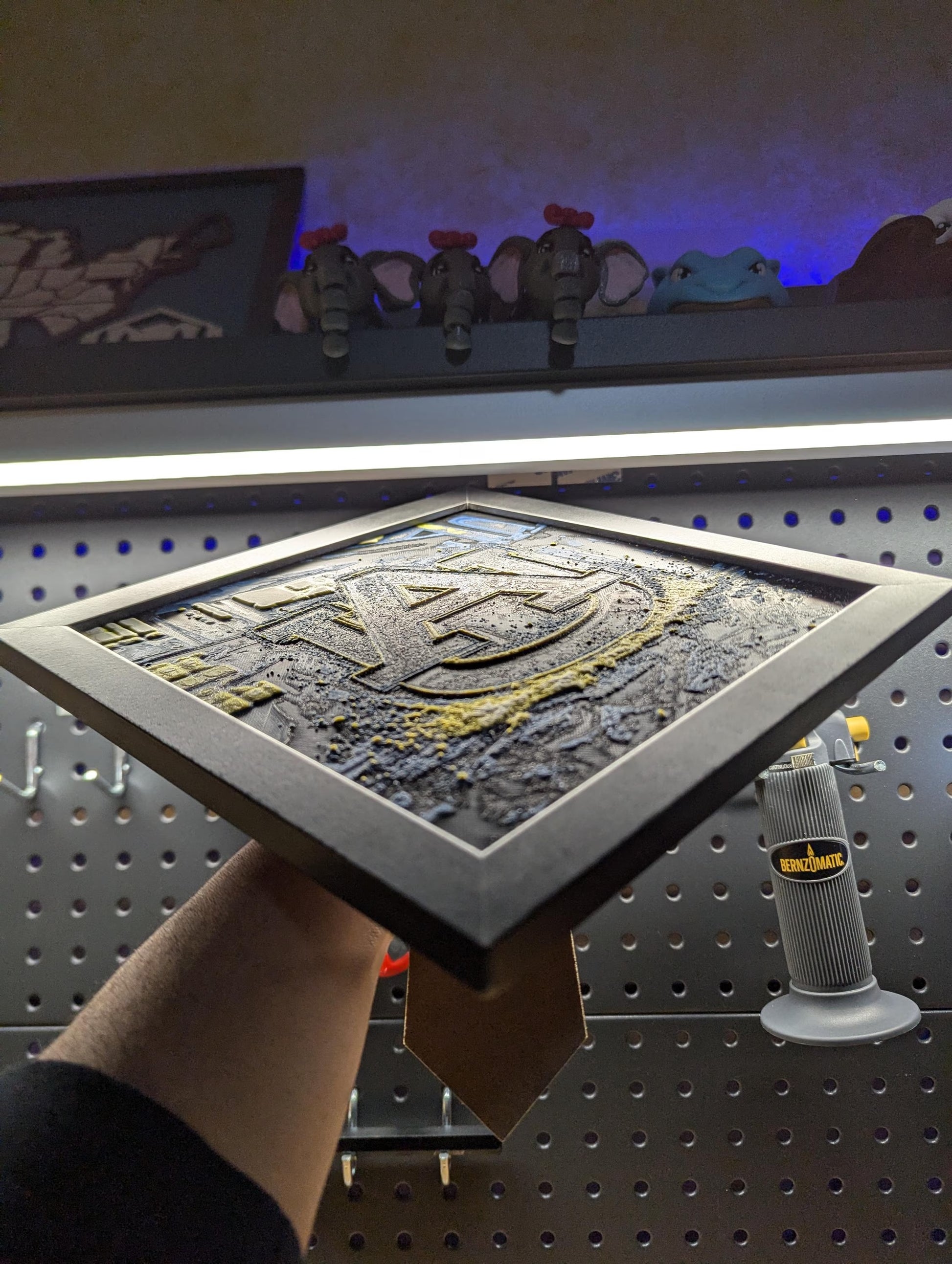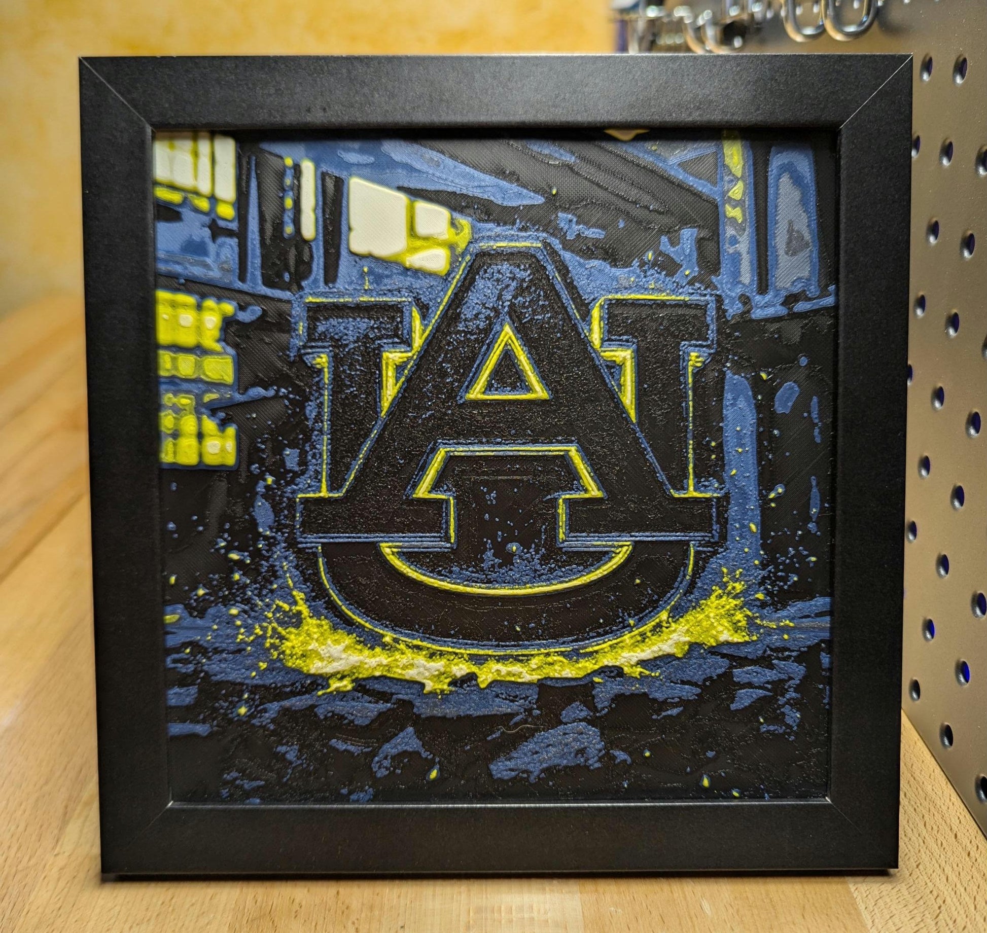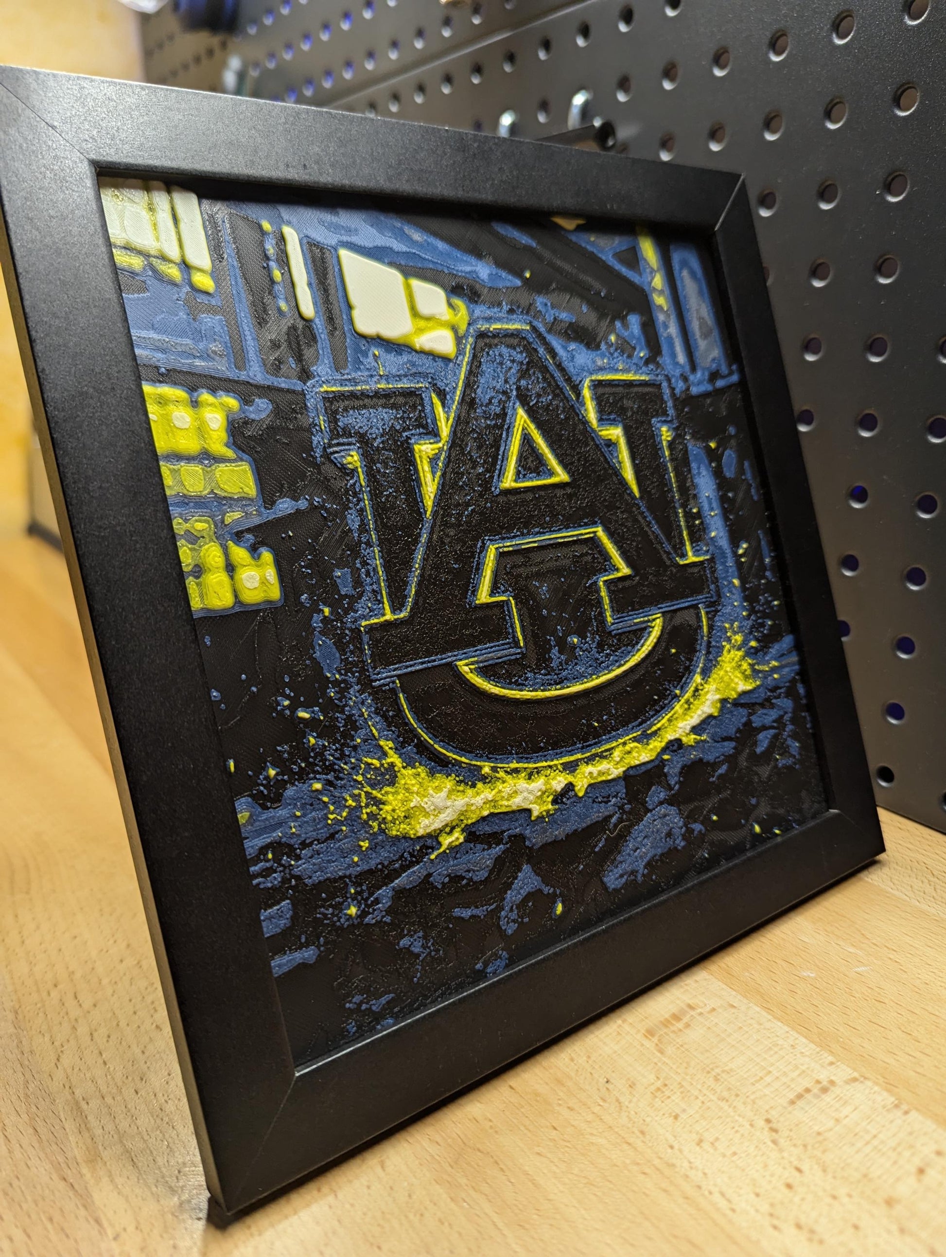 Show your Auburn pride with this meticulously crafted 3D-printed image featuring the Auburn University logo with an industrial-inspired background. Designed for the true Auburn fan, this piece blends the strength and tradition of Auburn with a bold, rugged aesthetic. The metallic textures and rustic-like details evoke industry's power, symbolizing Auburn’s relentless spirit and determination. This durable piece is printed from high-quality PLA filament and boasts a sleek, polished finish. It comes housed in a free lightweight frame, making it easy to display in any space, from offices to game rooms.