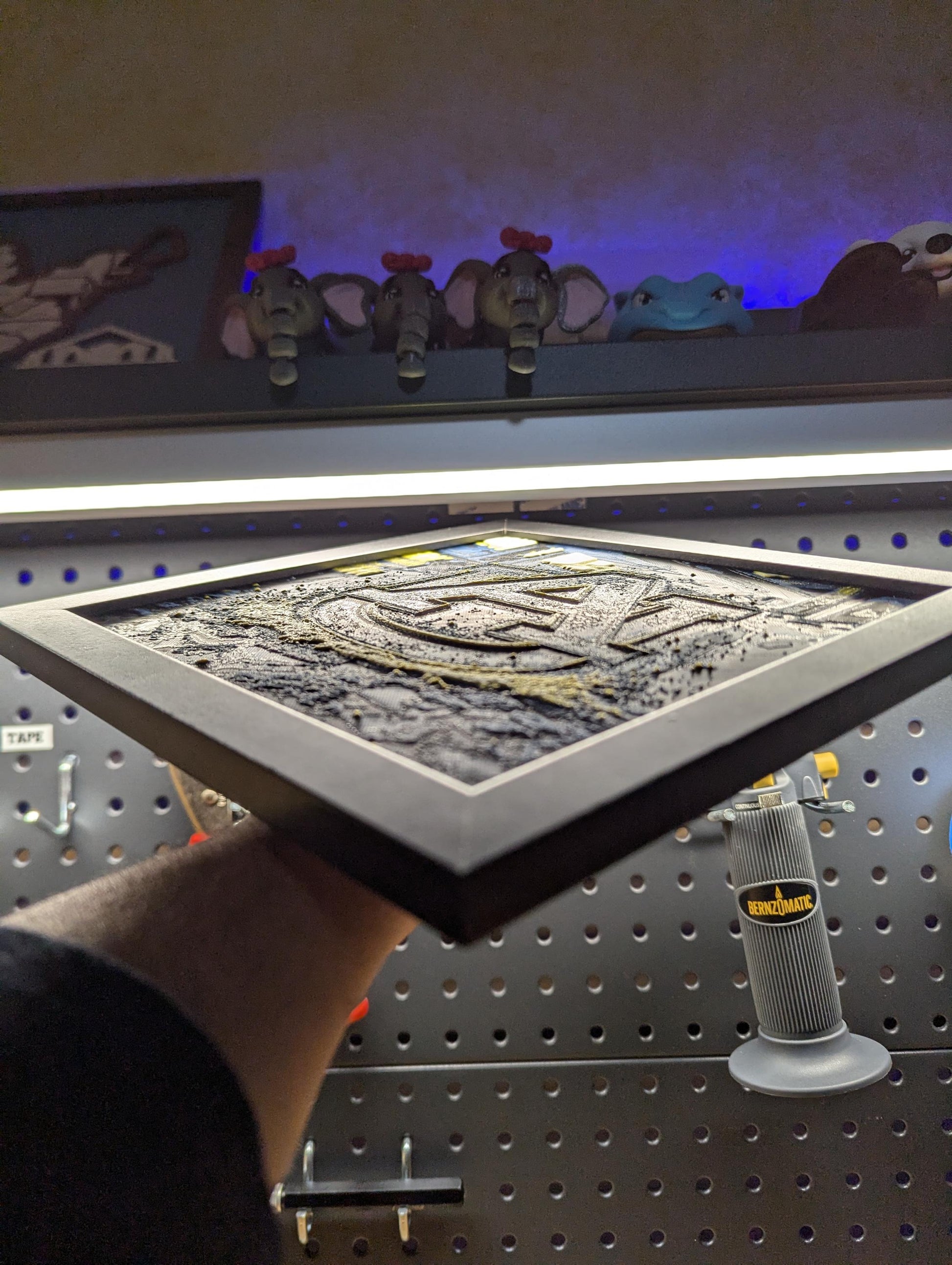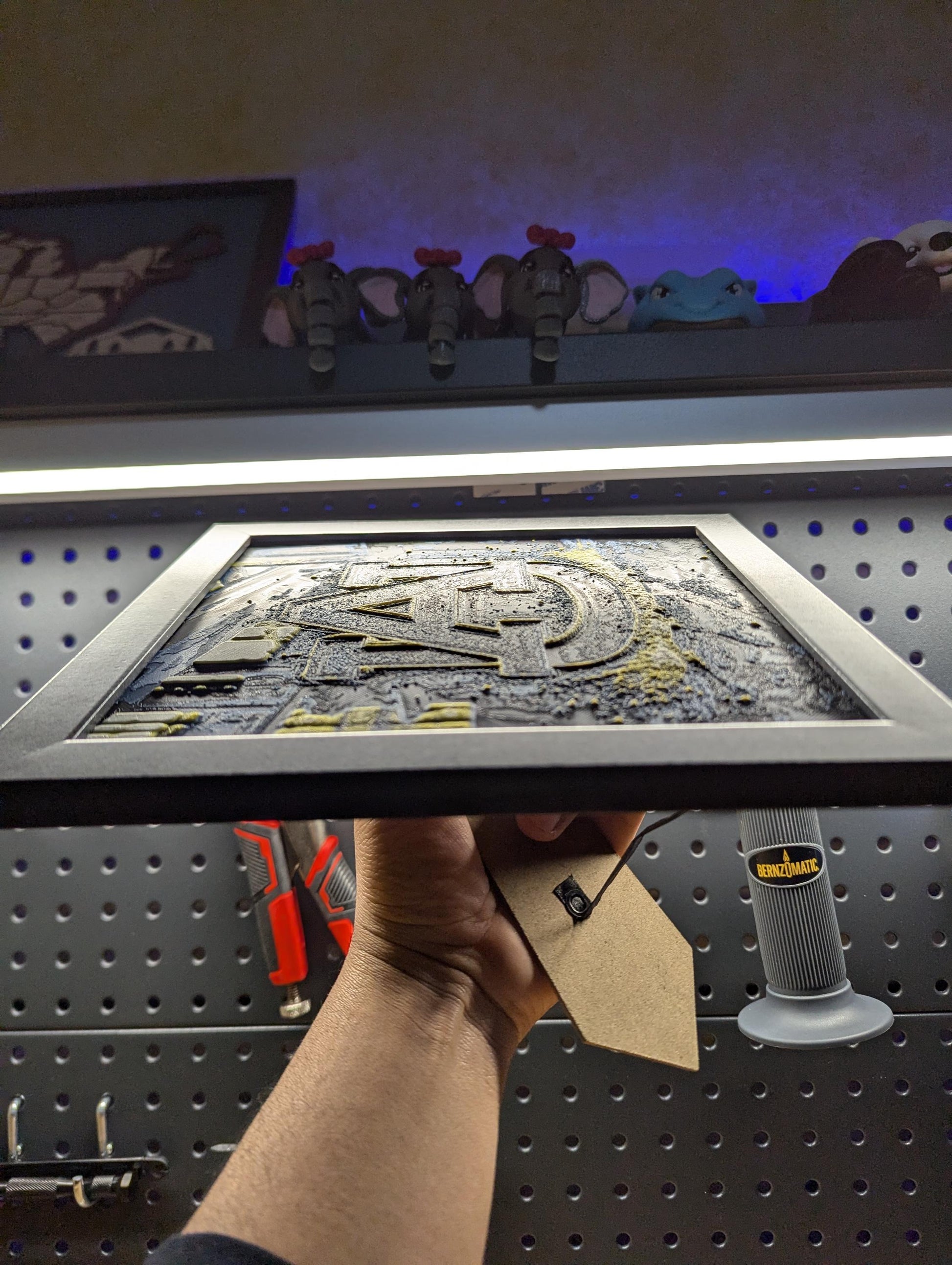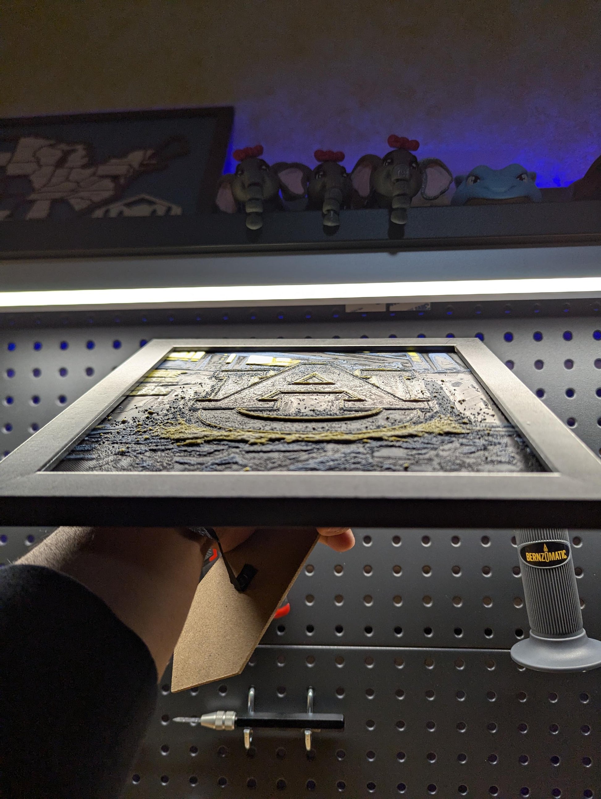 Show your Auburn pride with this meticulously crafted 3D-printed image featuring the Auburn University logo with an industrial-inspired background. Designed for the true Auburn fan, this piece blends the strength and tradition of Auburn with a bold, rugged aesthetic. The metallic textures and rustic-like details evoke industry's power, symbolizing Auburn’s relentless spirit and determination. This durable piece is printed from high-quality PLA filament and boasts a sleek, polished finish. It comes housed in a free lightweight frame, making it easy to display in any space, from offices to game rooms.