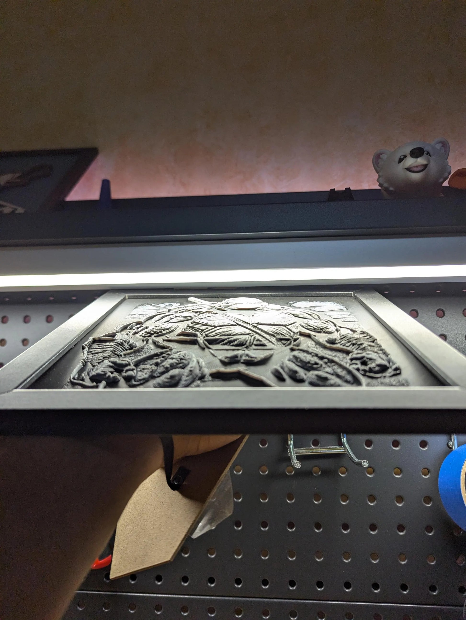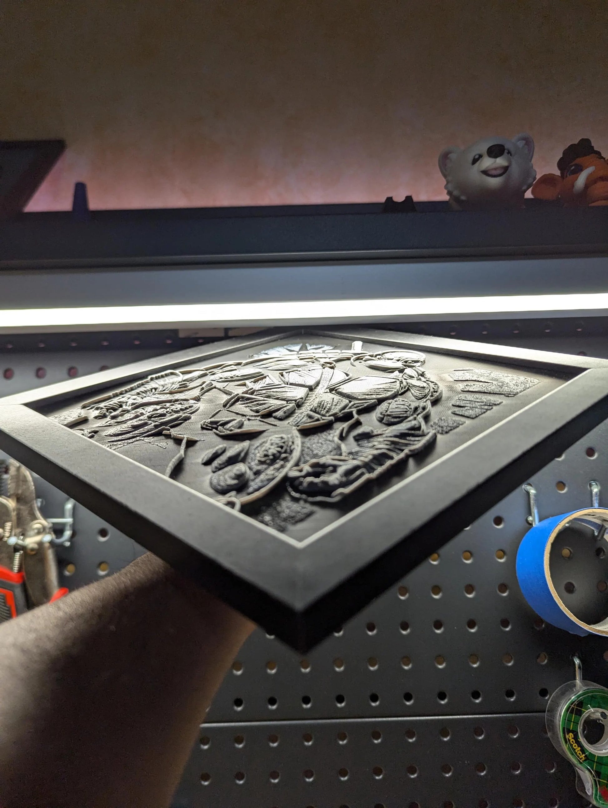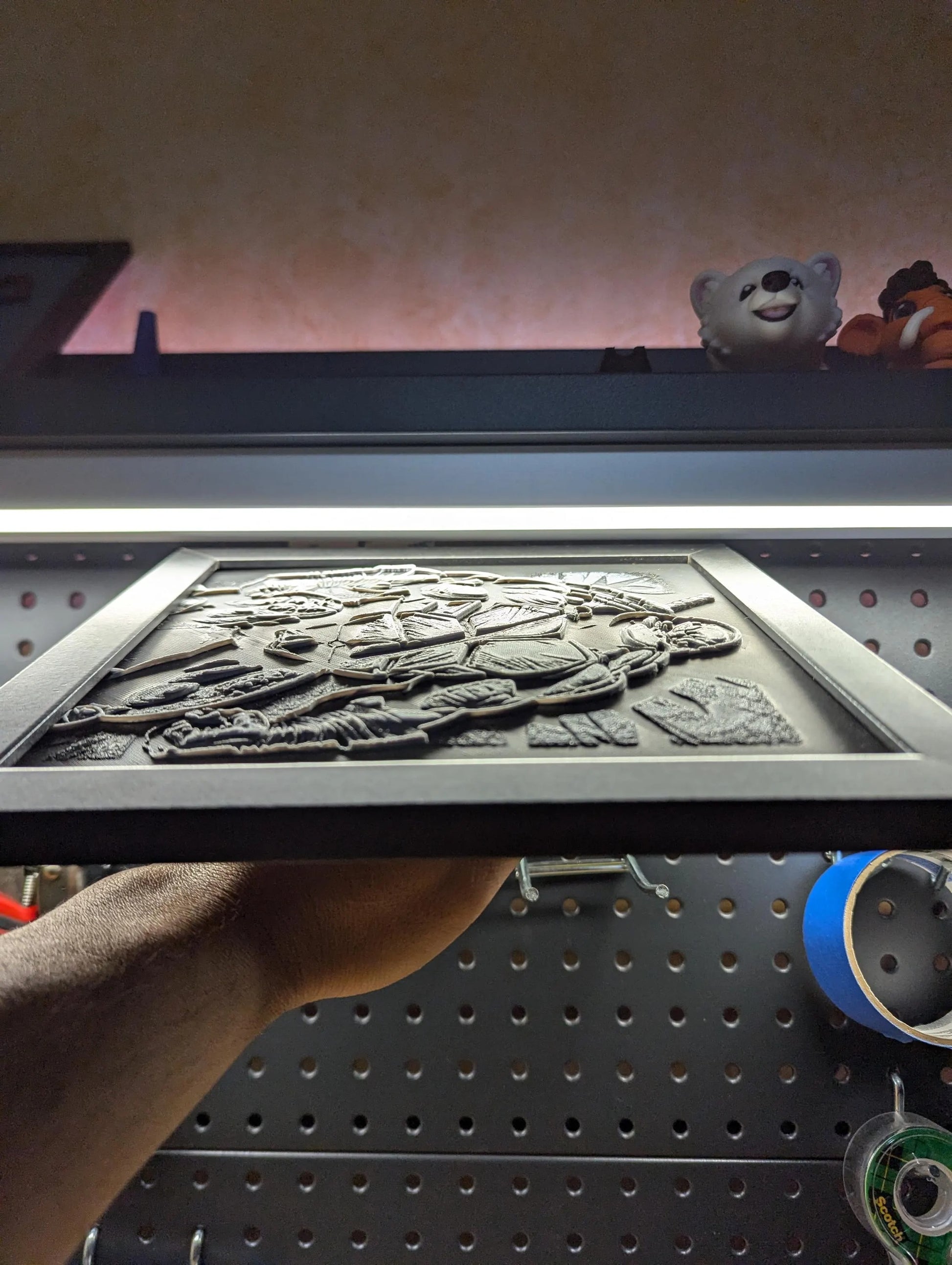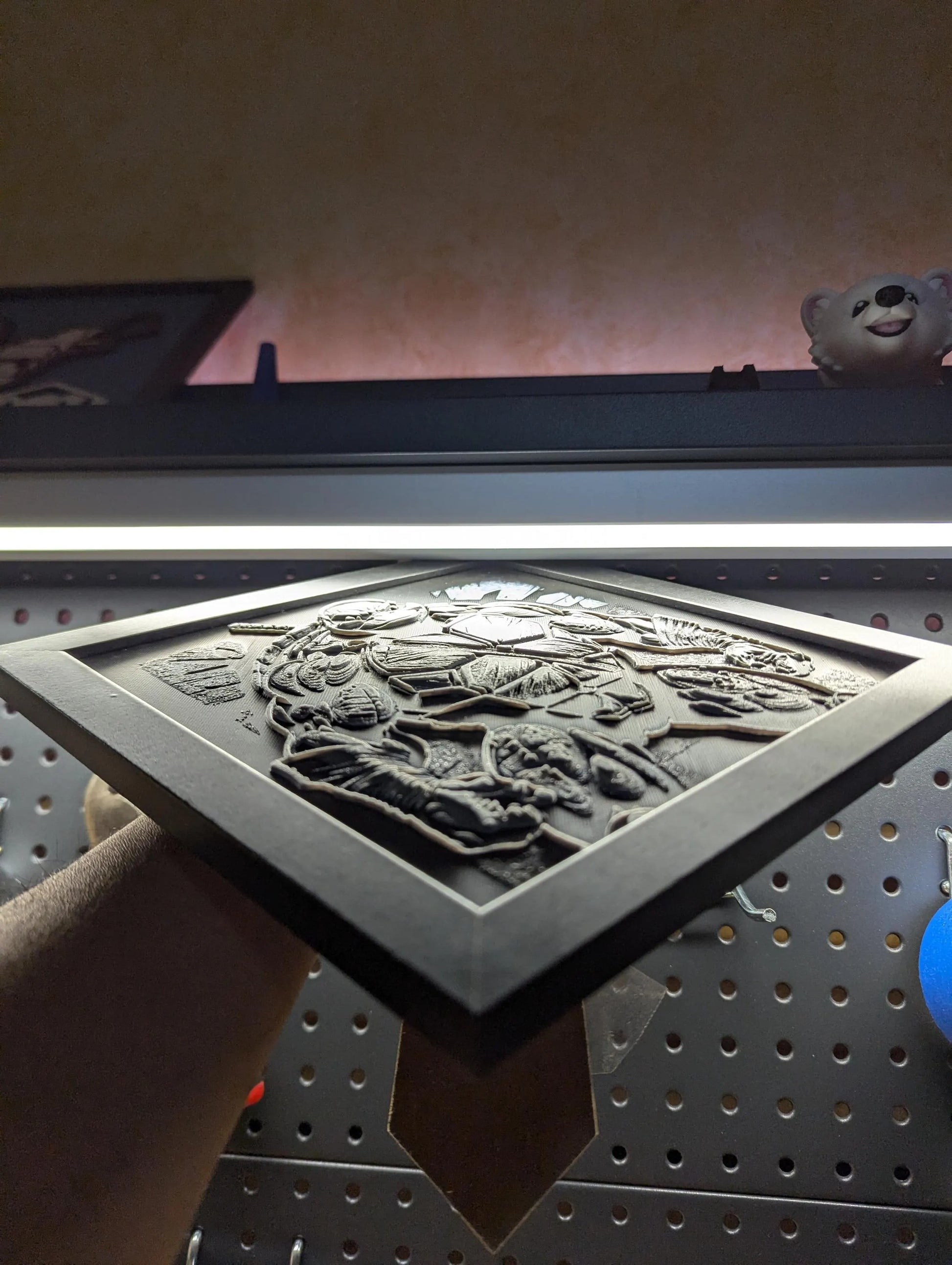 The image is printed from high-quality PLA filament, ensuring durability and a sleek, polished finish. It is housed in a free lightweight frame, making it easy to display and move around.