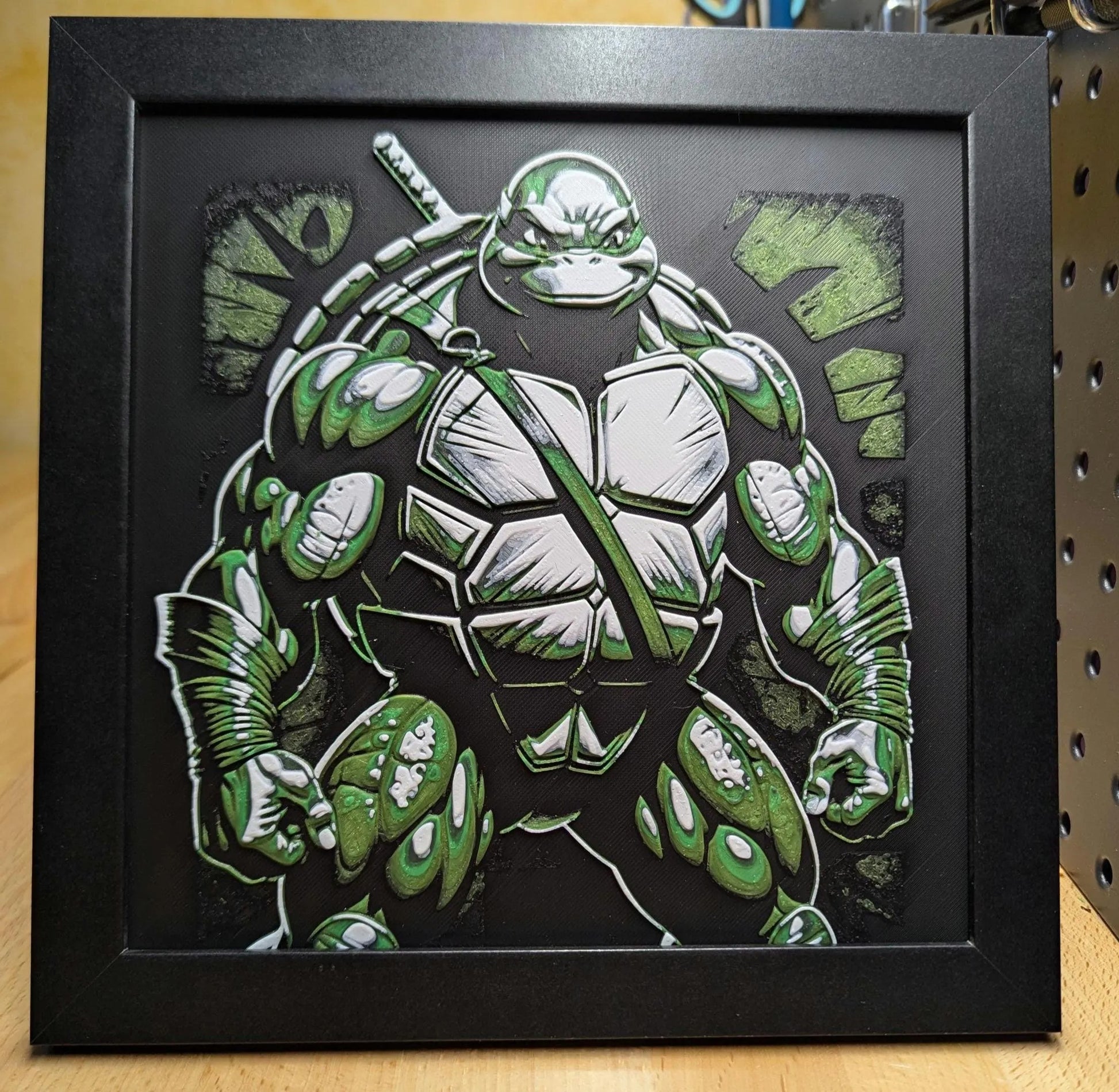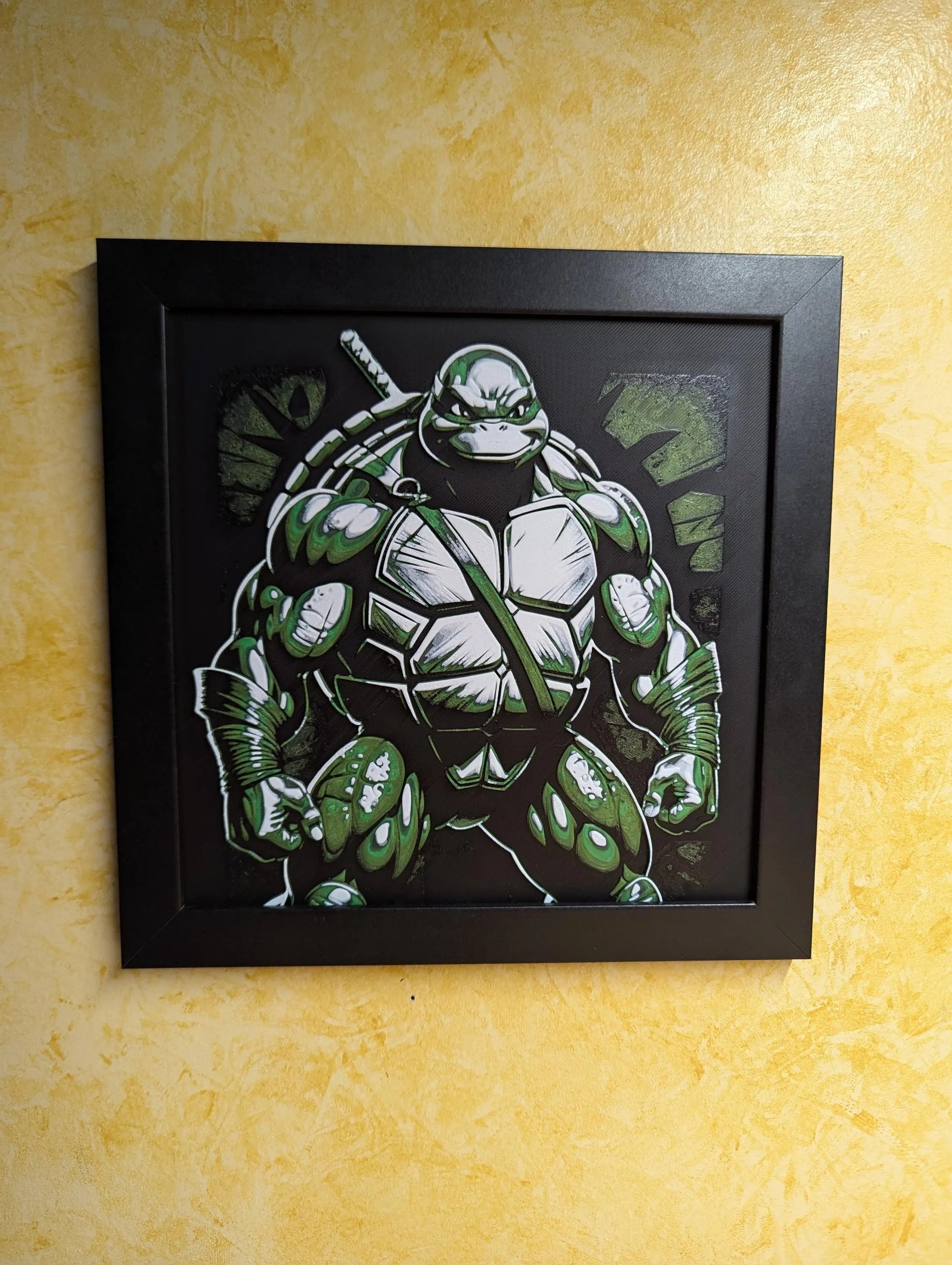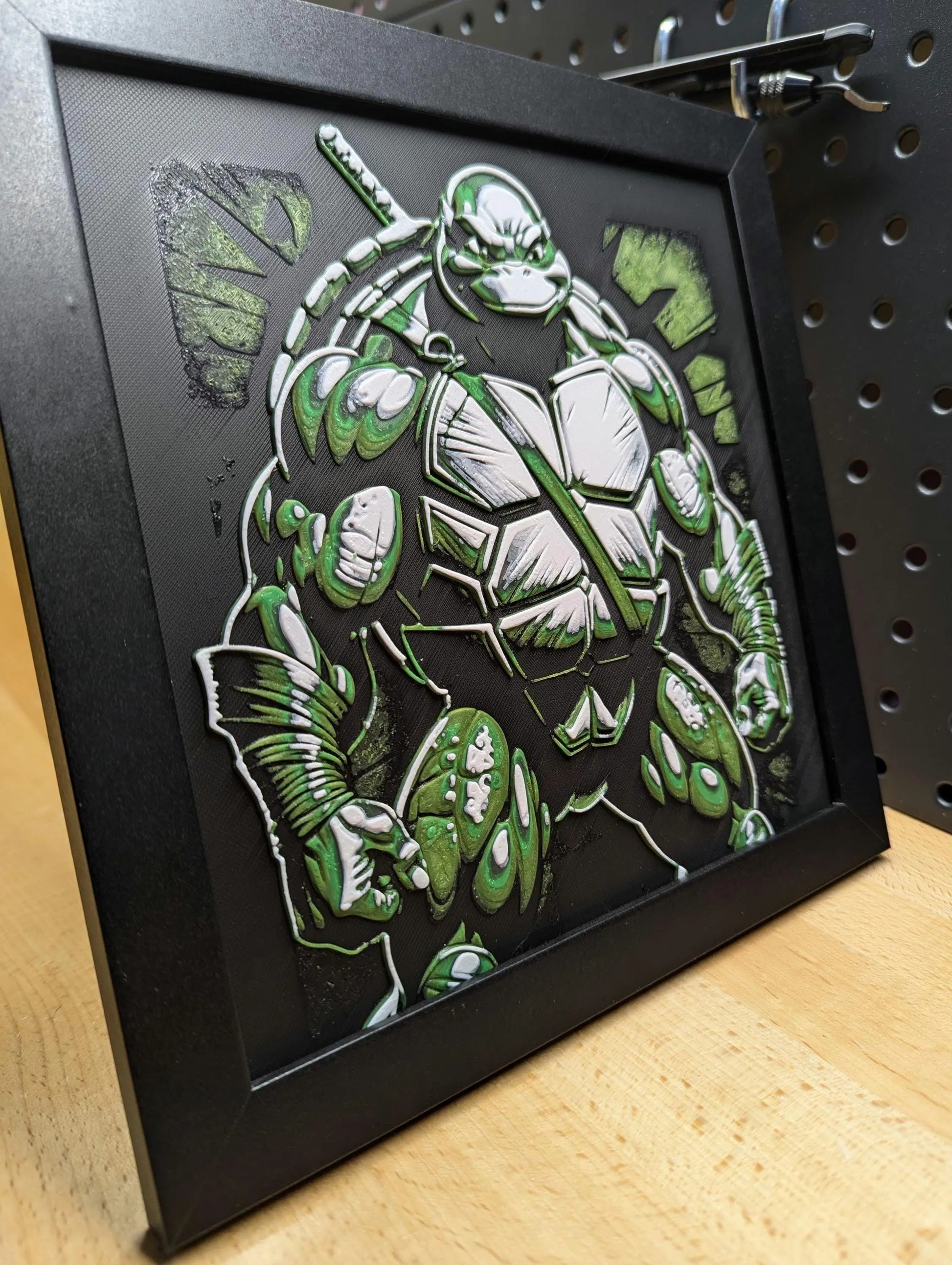 3D printed Comic-themed image of a Ninja Turtle in the center