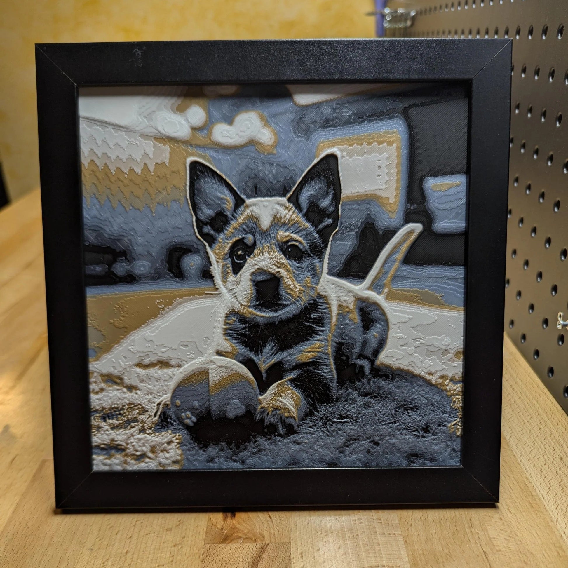 Bring the charm and energy of a Blue Heeler puppy into your space with this adorable 3D printed image. Perfect for dog lovers and admirers of this intelligent and hardworking breed, this piece captures the playful nature and alert expression of a Blue Heeler puppy, making it a heartwarming addition to any room. The detailed design adds a touch of sweetness and love for canine companions.