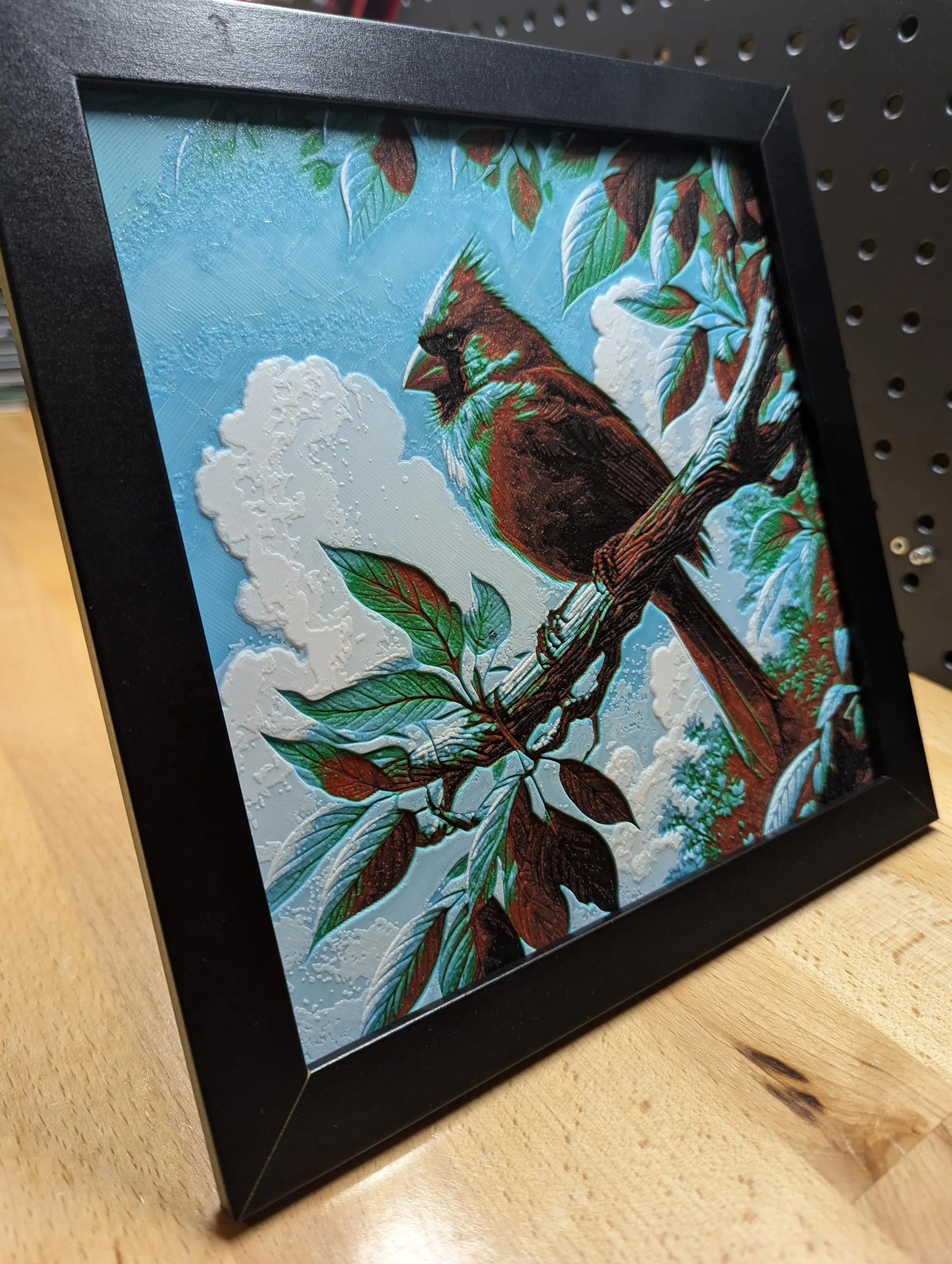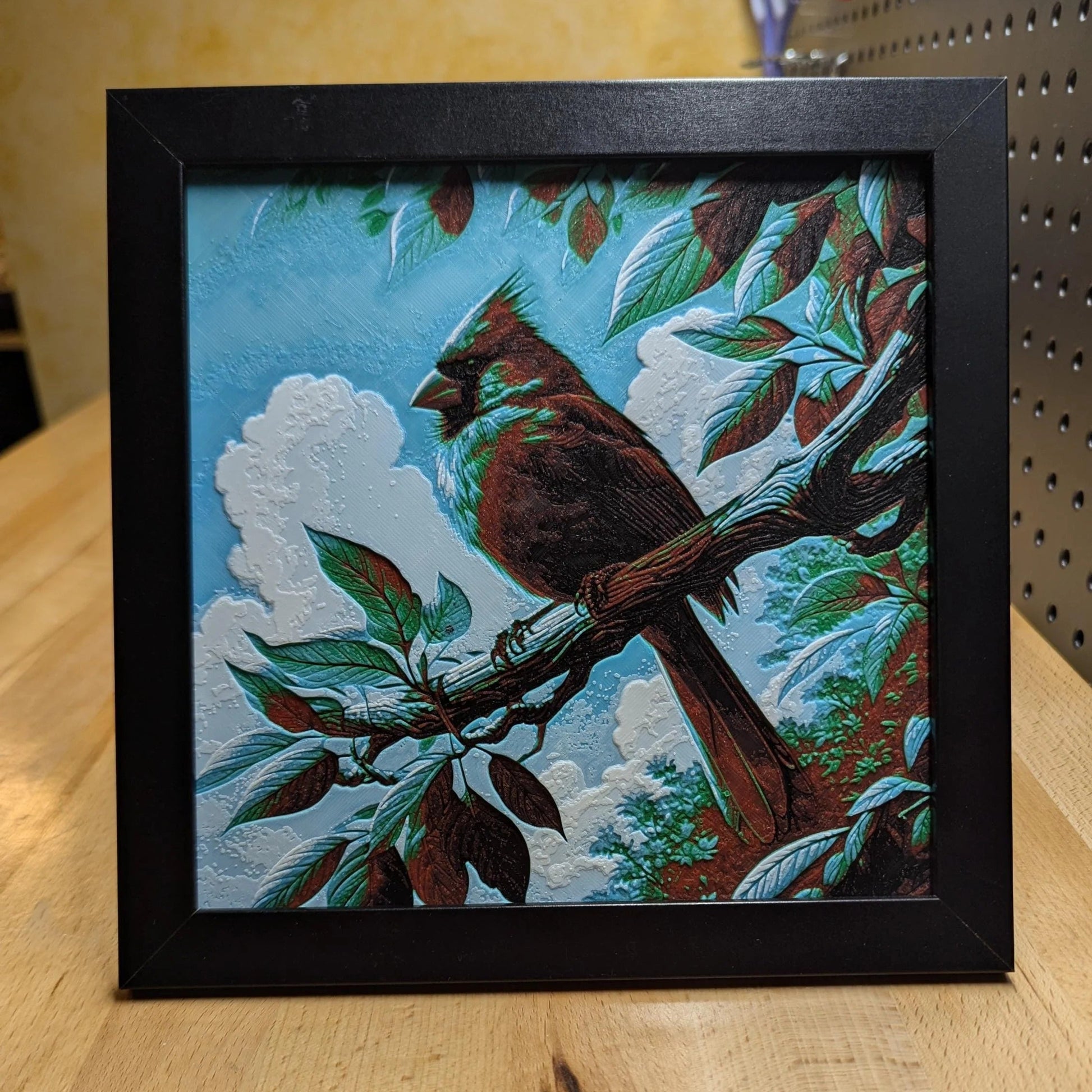 Bring the vibrant beauty of nature into your space with this stunning 3D printed image of a cardinal sitting on a tree branch. Perfect for bird lovers and those who appreciate the elegance of wildlife, this piece captures the striking red plumage of the cardinal perched gracefully, making it a charming and serene addition to any room. The intricate design highlights the bird’s detail and the peaceful nature of its environment.