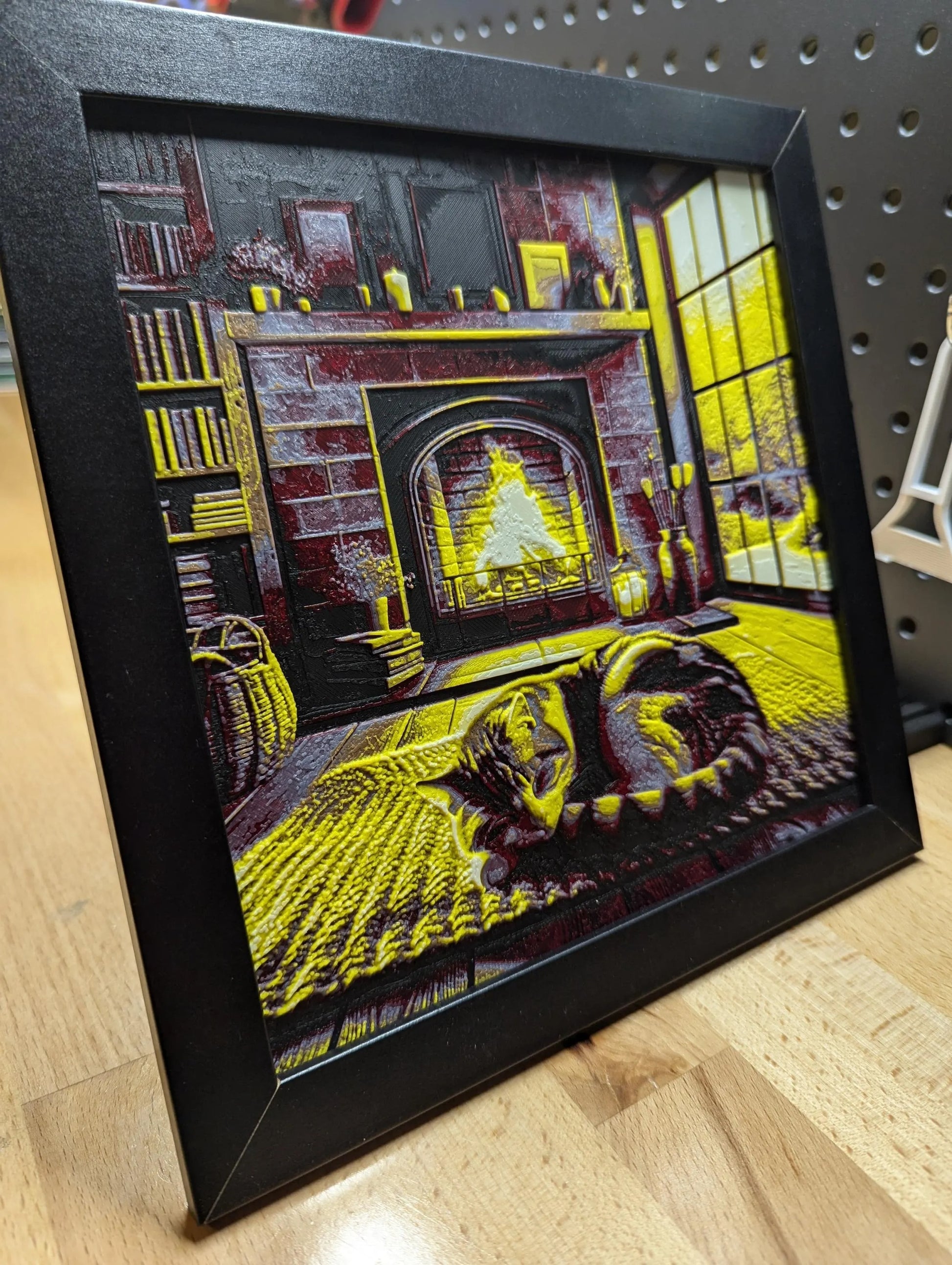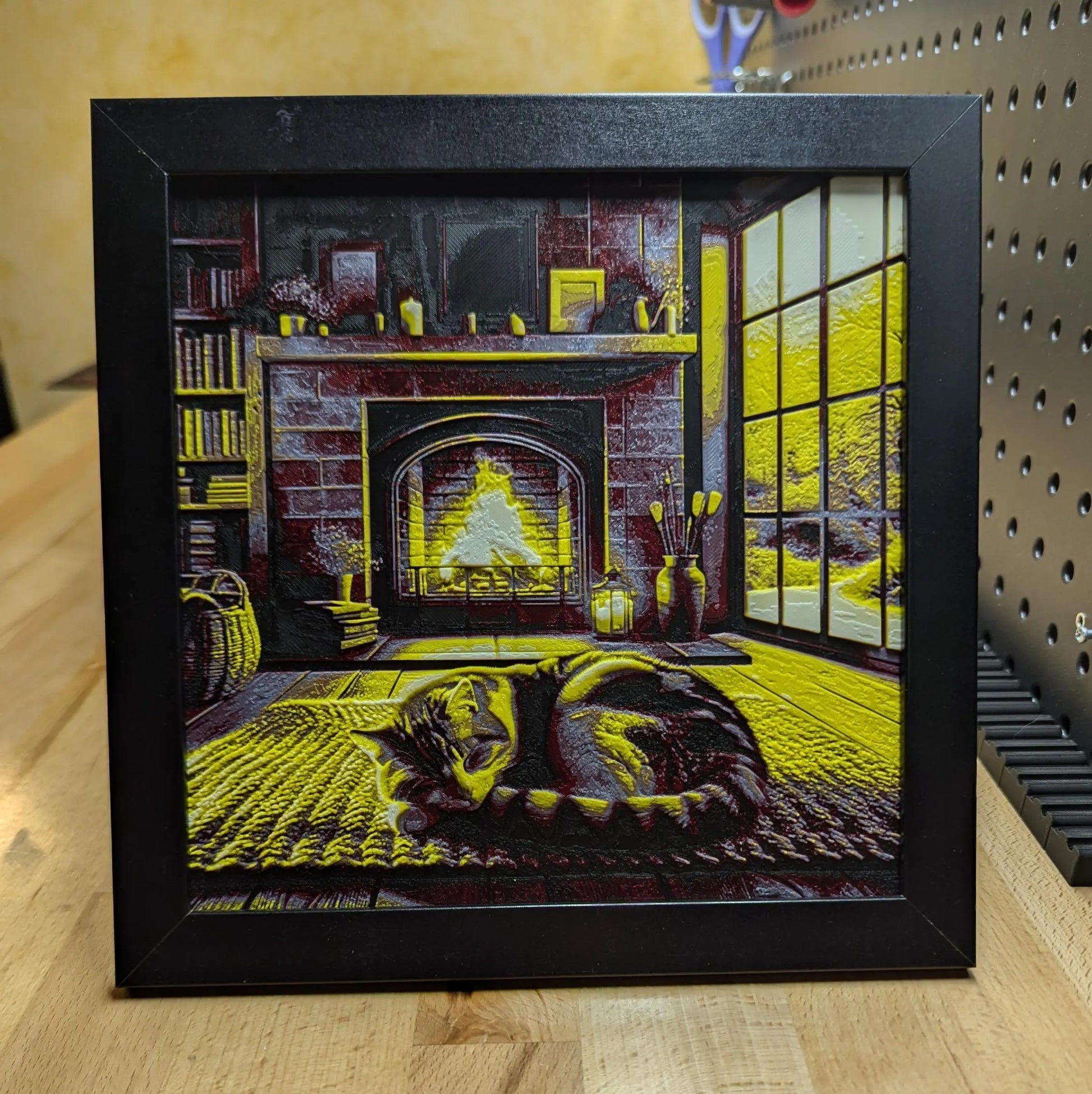 Bring the warmth and comfort of a cozy night in with this charming 3D printed image of a cat laying in front of a fireplace. Perfect for cat lovers and those who cherish the cozy vibes of home, this piece captures the serene contentment of a cat basking in the gentle glow of a fireplace. The detailed design adds a heartwarming and tranquil touch to any room, reminding you of the simple joys of relaxation.