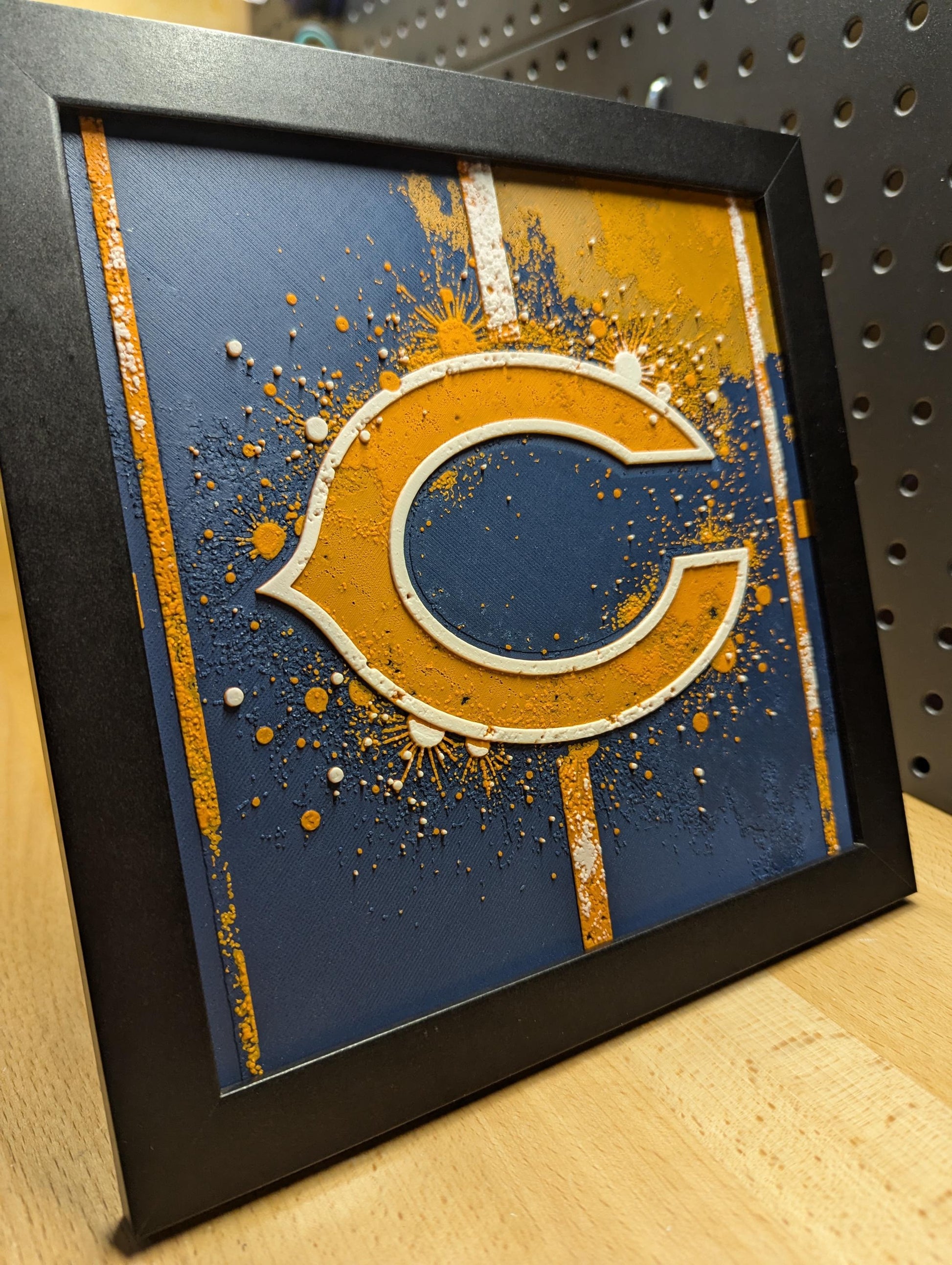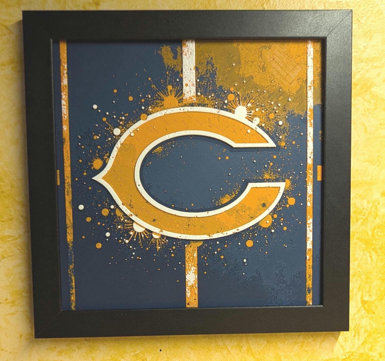 Show your pride for the Chicago Bears with a bold artistic twist through this 3D-printed image of the Chicago Bears logo, featuring a dynamic paint splatter effect. Perfect for die-hard Bears fans who love adding creative flair to their team spirit, this piece combines the iconic logo with a burst of energetic color. Set against a detailed football field background, this artwork brings the excitement of game day into any space, making it a standout addition to your collection!