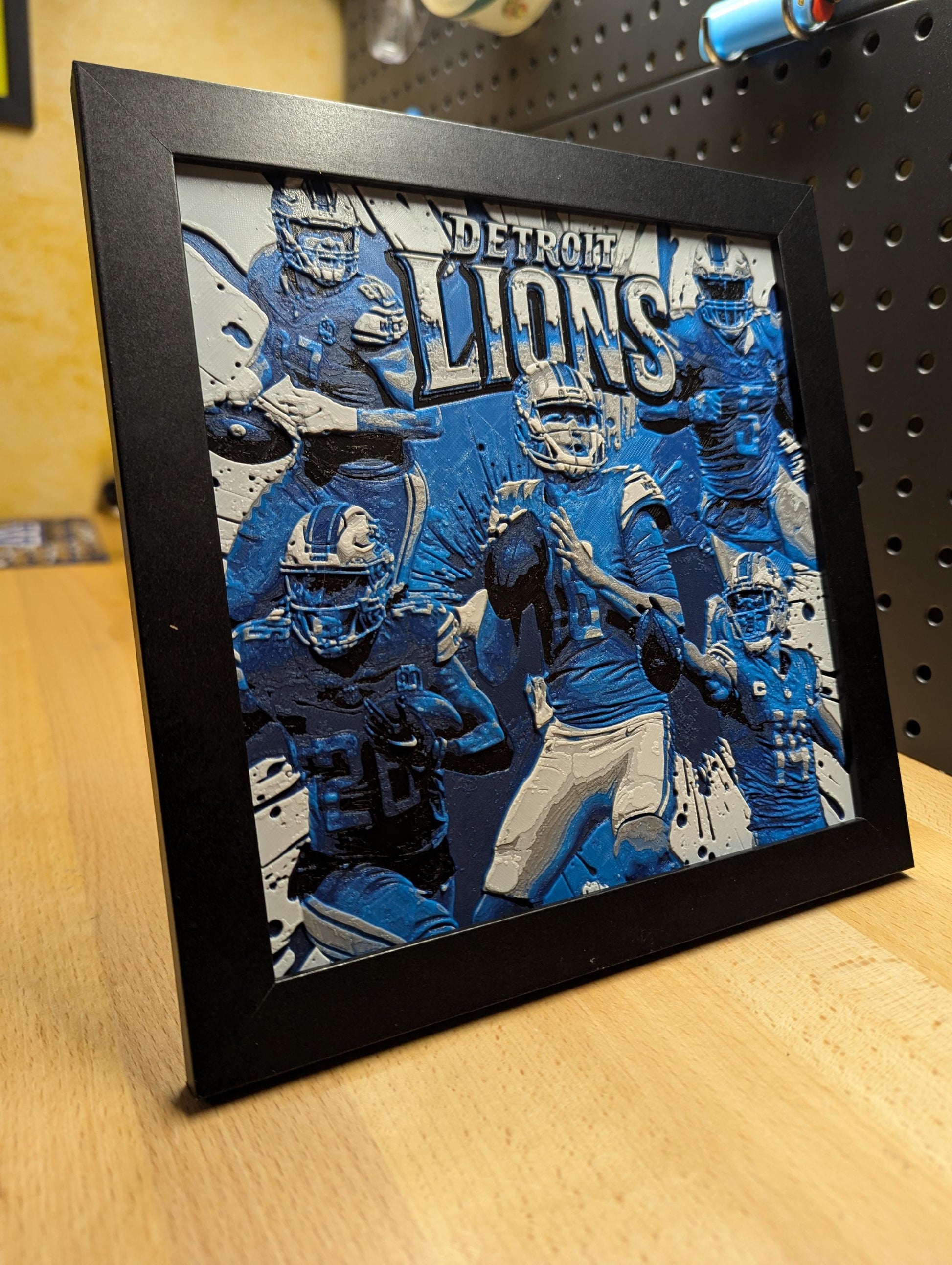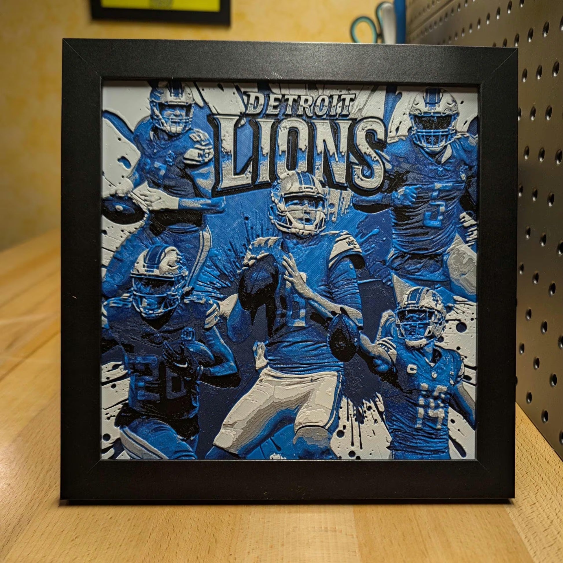 Show your pride for the Detroit Lions with a bold artistic twist through this 3D printed image of the Detroit Lions logo with a dynamic paint splatter effect. Perfect for die-hard Lions fans who enjoy adding creative flair to their team spirit, this piece combines the iconic logo with a burst of energetic color, making it a standout addition to any space.