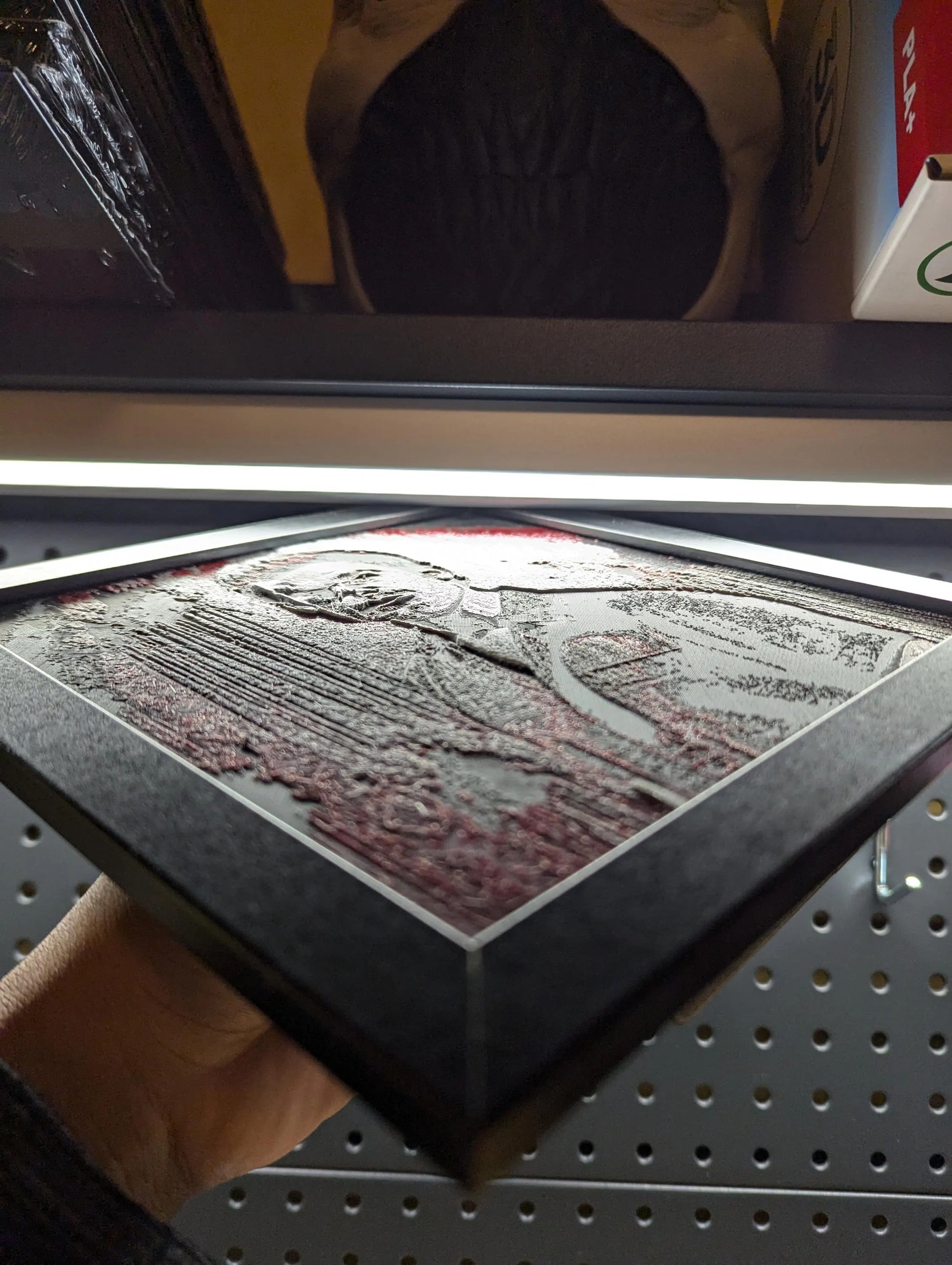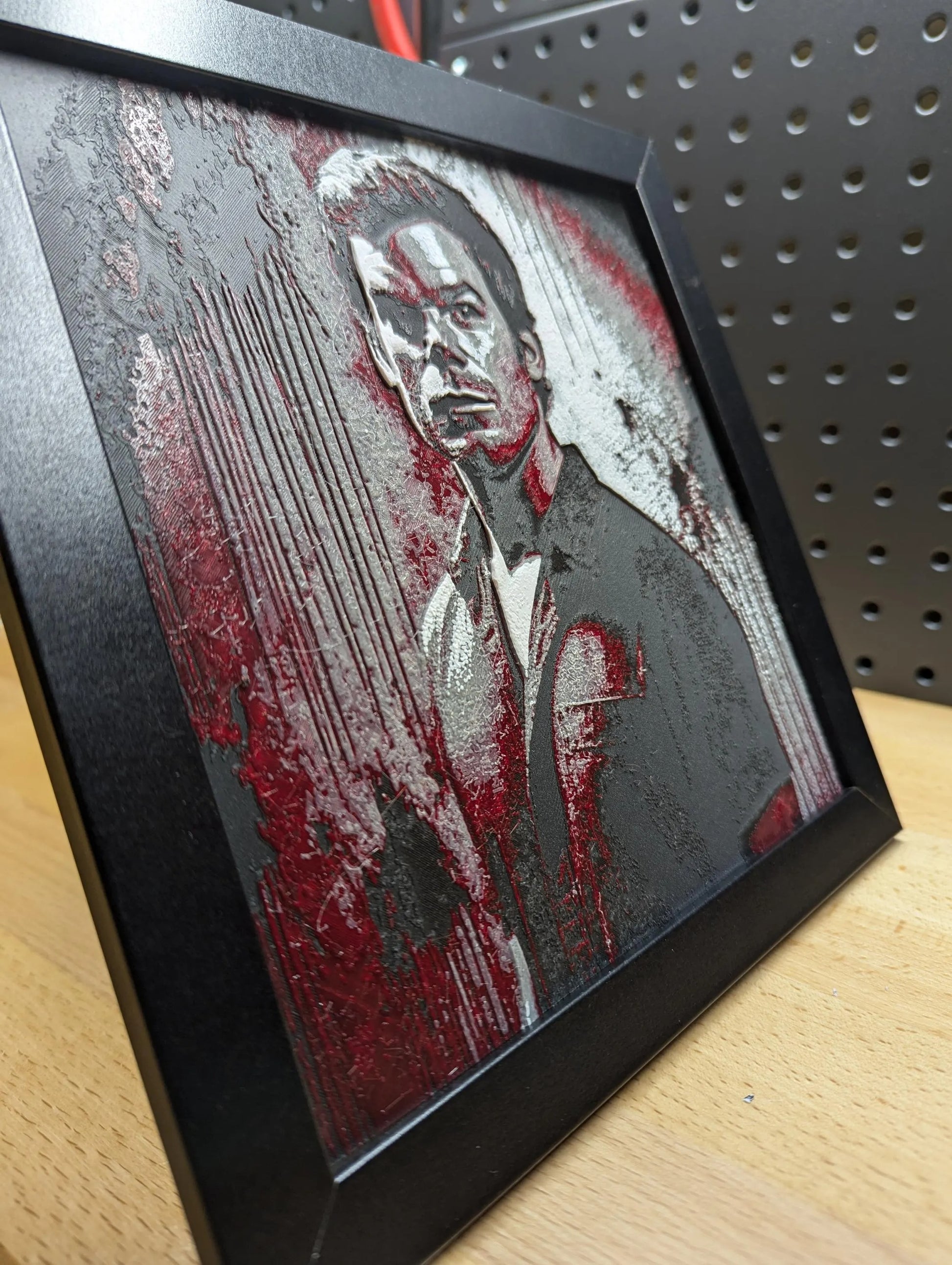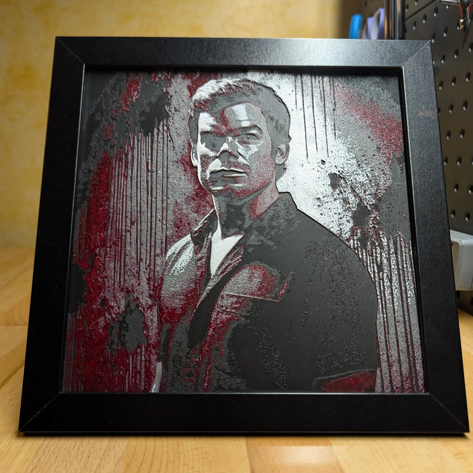 Immerse yourself in the world of Dexter with this meticulously crafted 3D printed image of Dexter Morgan. Perfect for any fan of the iconic TV series, this piece captures the enigmatic essence of the beloved character. The image is printed from high-quality PLA filament, ensuring durability and a sleek, polished finish. It is housed in a free lightweight frame, making it easy to display and move around.