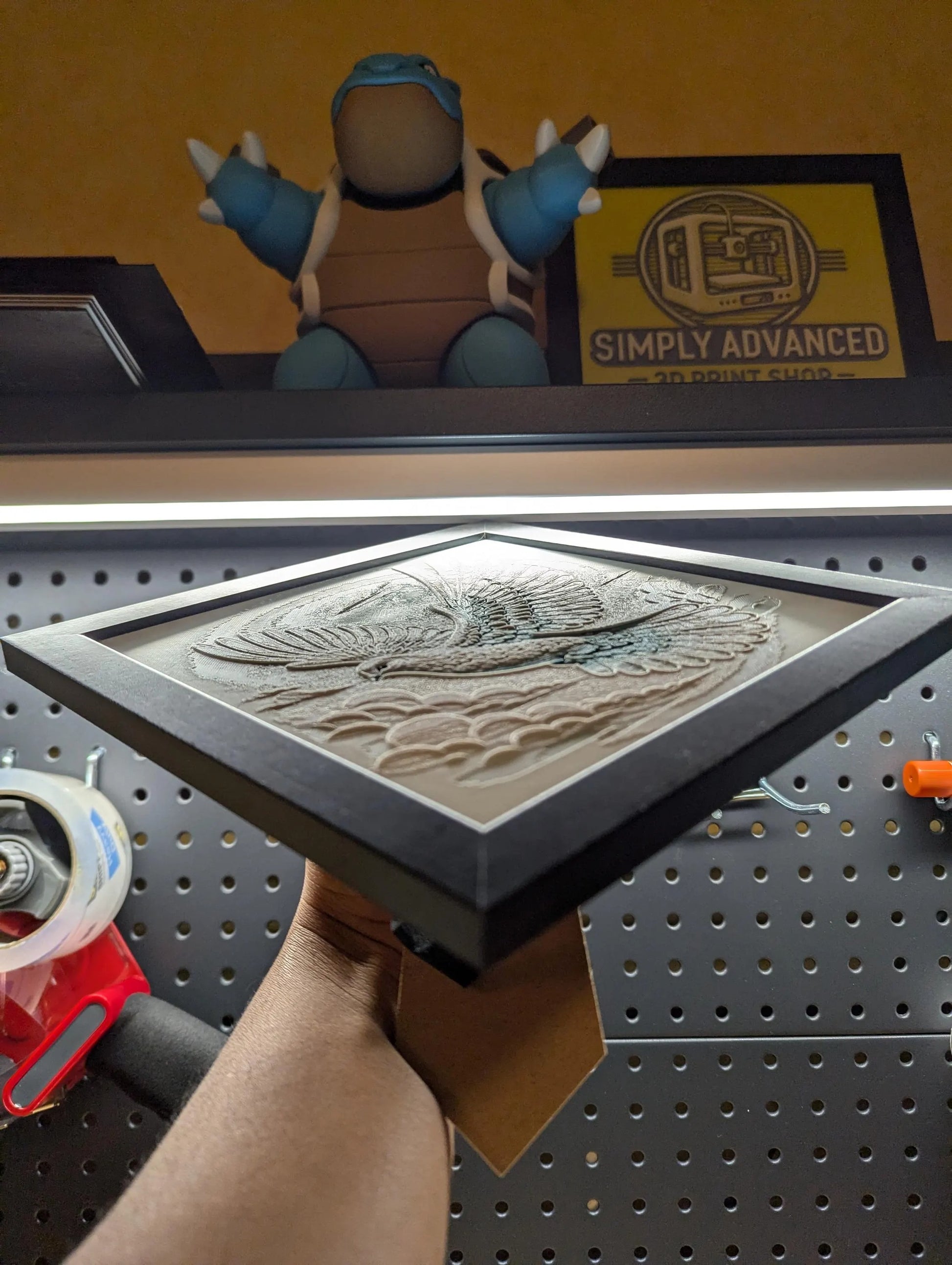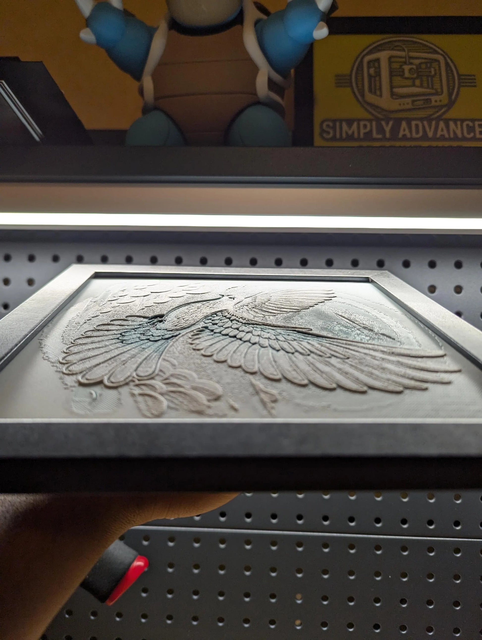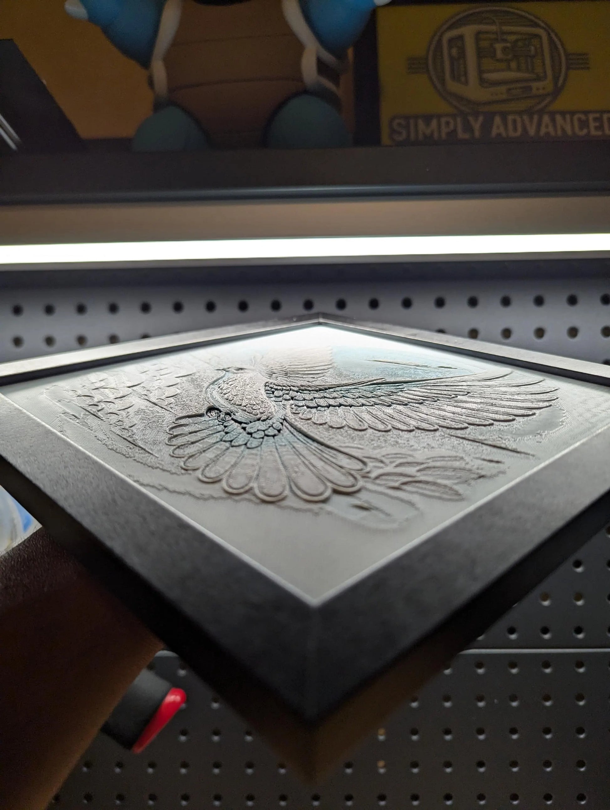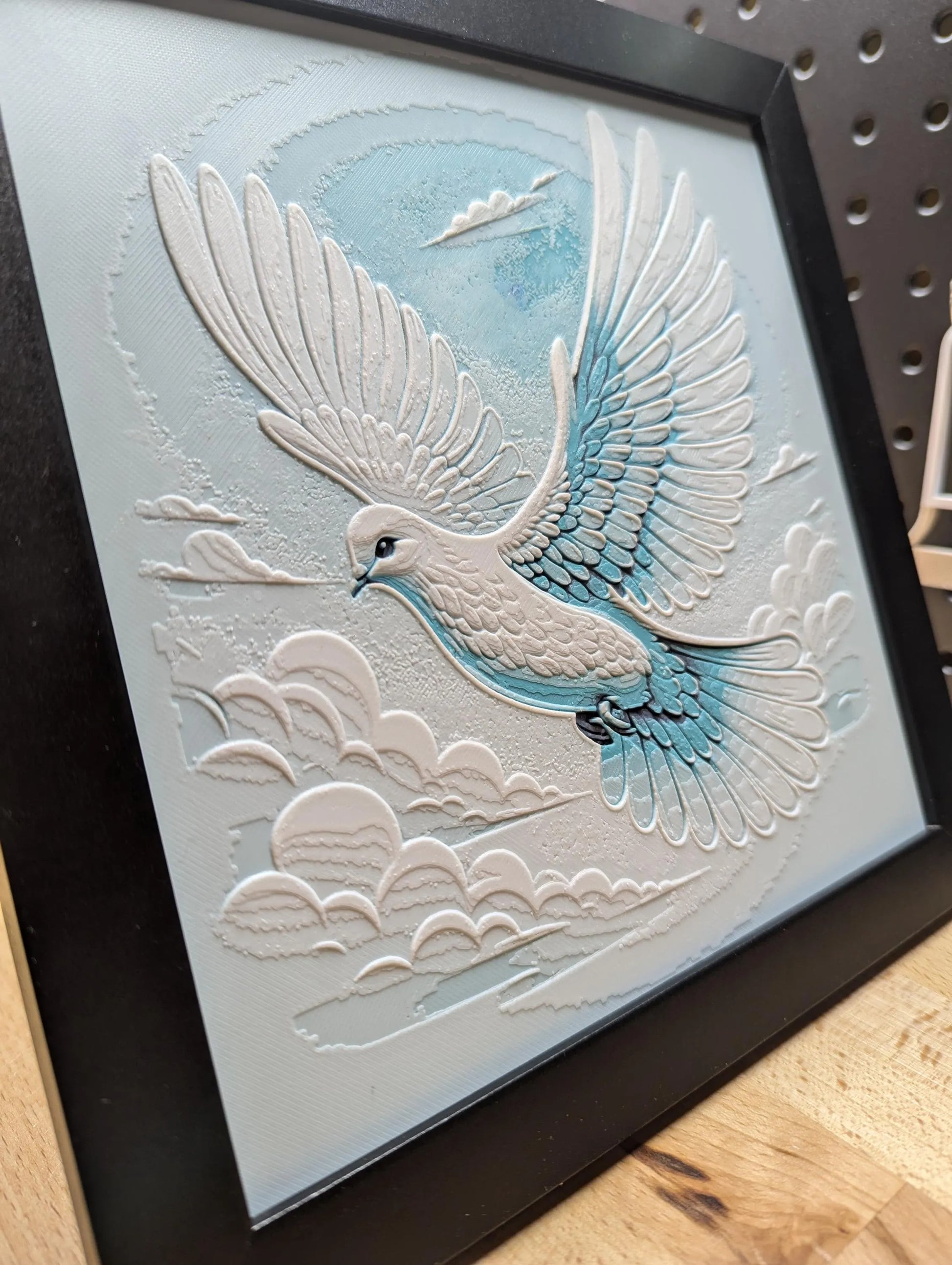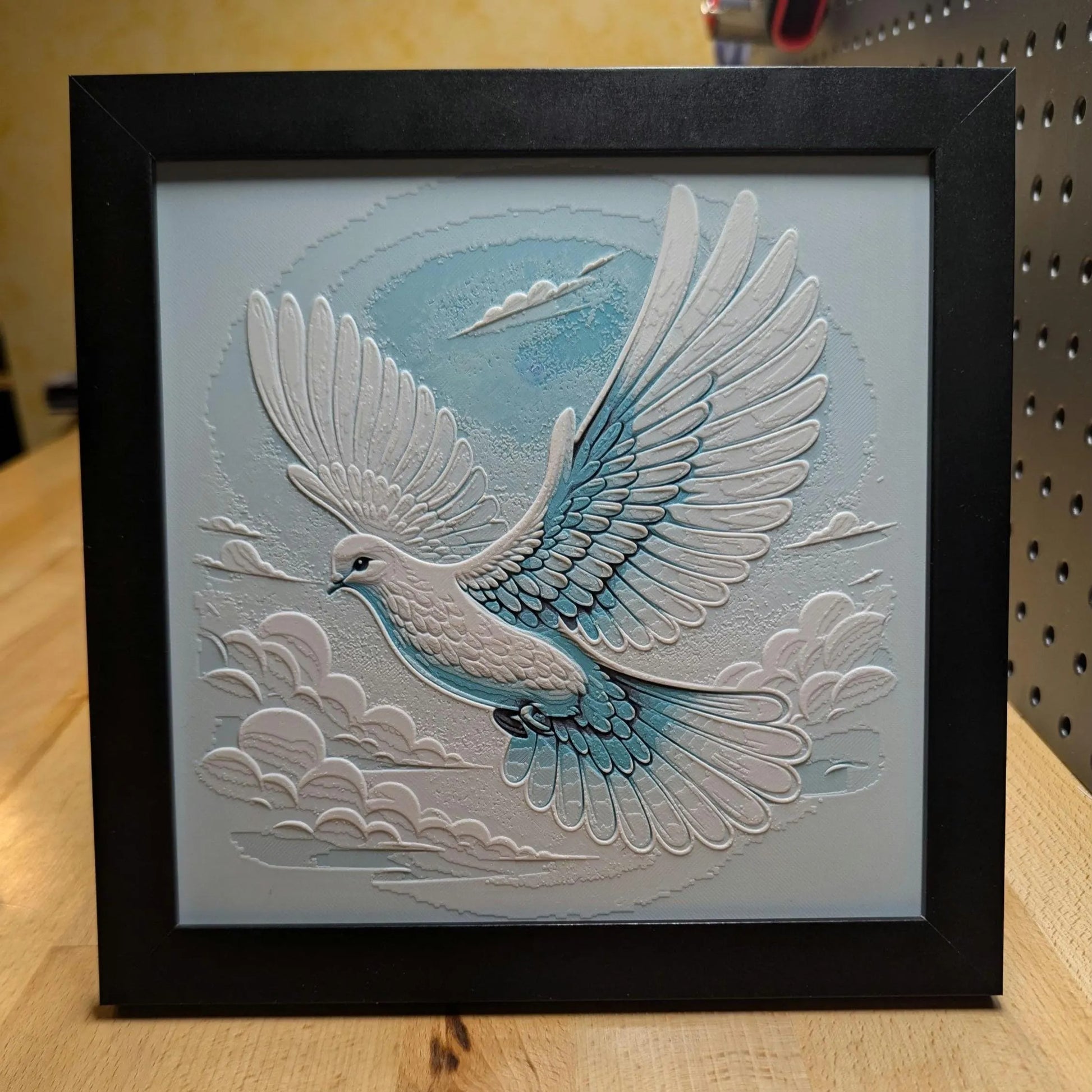 Bring a sense of peace and serenity into your space with this beautiful 3D printed image of a dove soaring through the clouds. Perfect for those who appreciate symbols of hope and tranquility, this piece captures the grace and freedom of a dove gliding across a soft, cloud-filled sky. The detailed design brings a sense of calm and inspiration, making it a lovely addition to any decor.