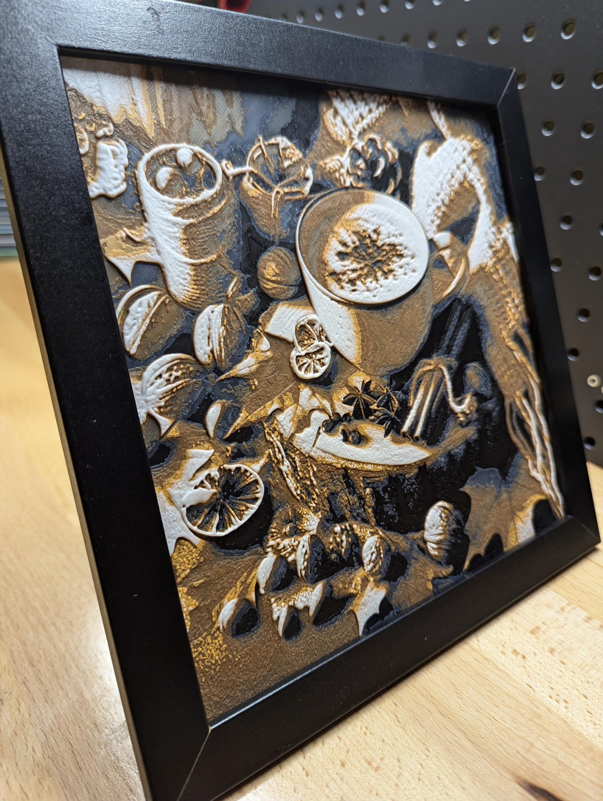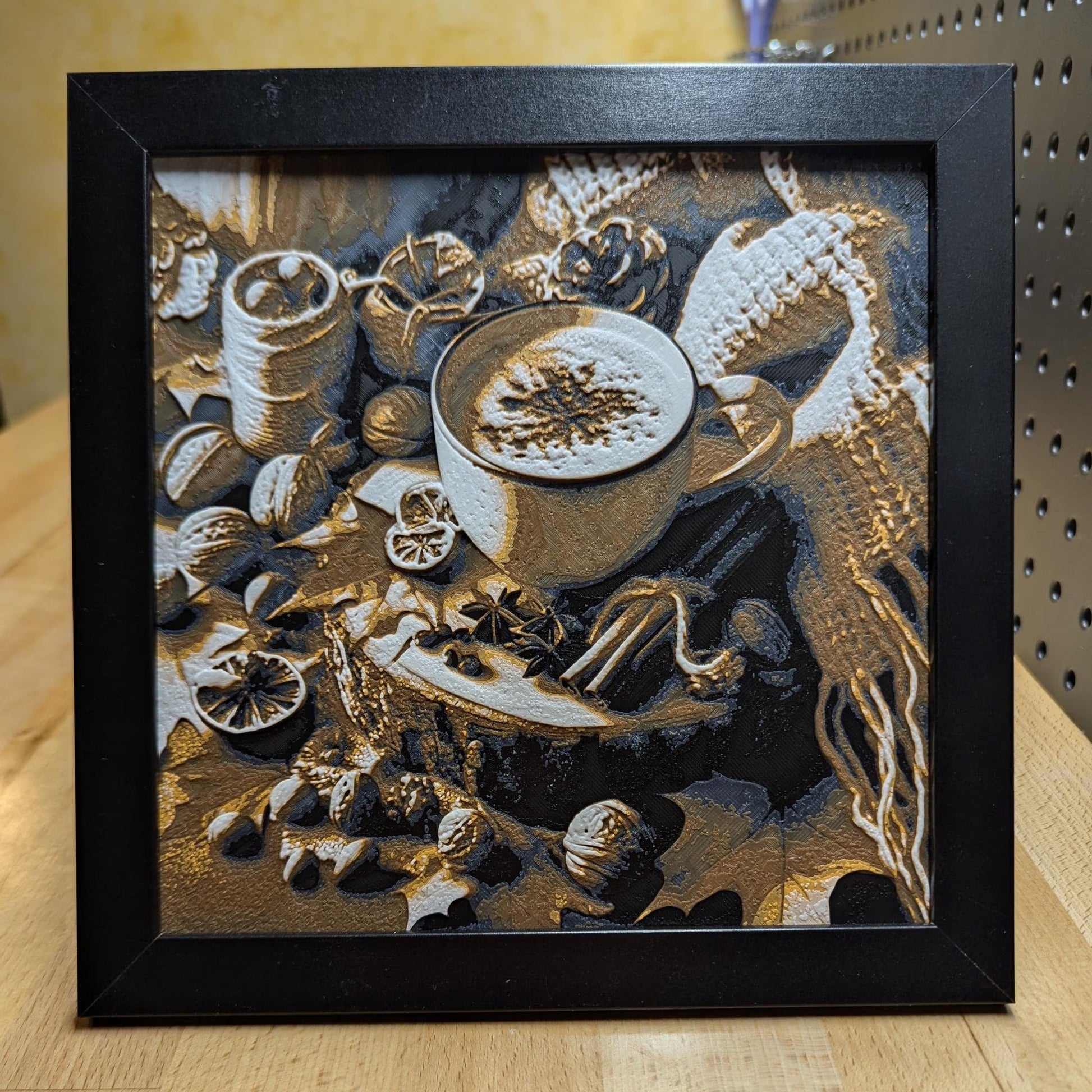 Embrace the cozy warmth of fall with this beautifully crafted 3D printed image featuring a cup of coffee at the center of an autumn scene. Perfect for coffee lovers and those who enjoy the essence of the fall season, this piece captures the comforting vibe of crisp autumn days, with warm hues and seasonal details that bring a sense of tranquility and relaxation to any space.