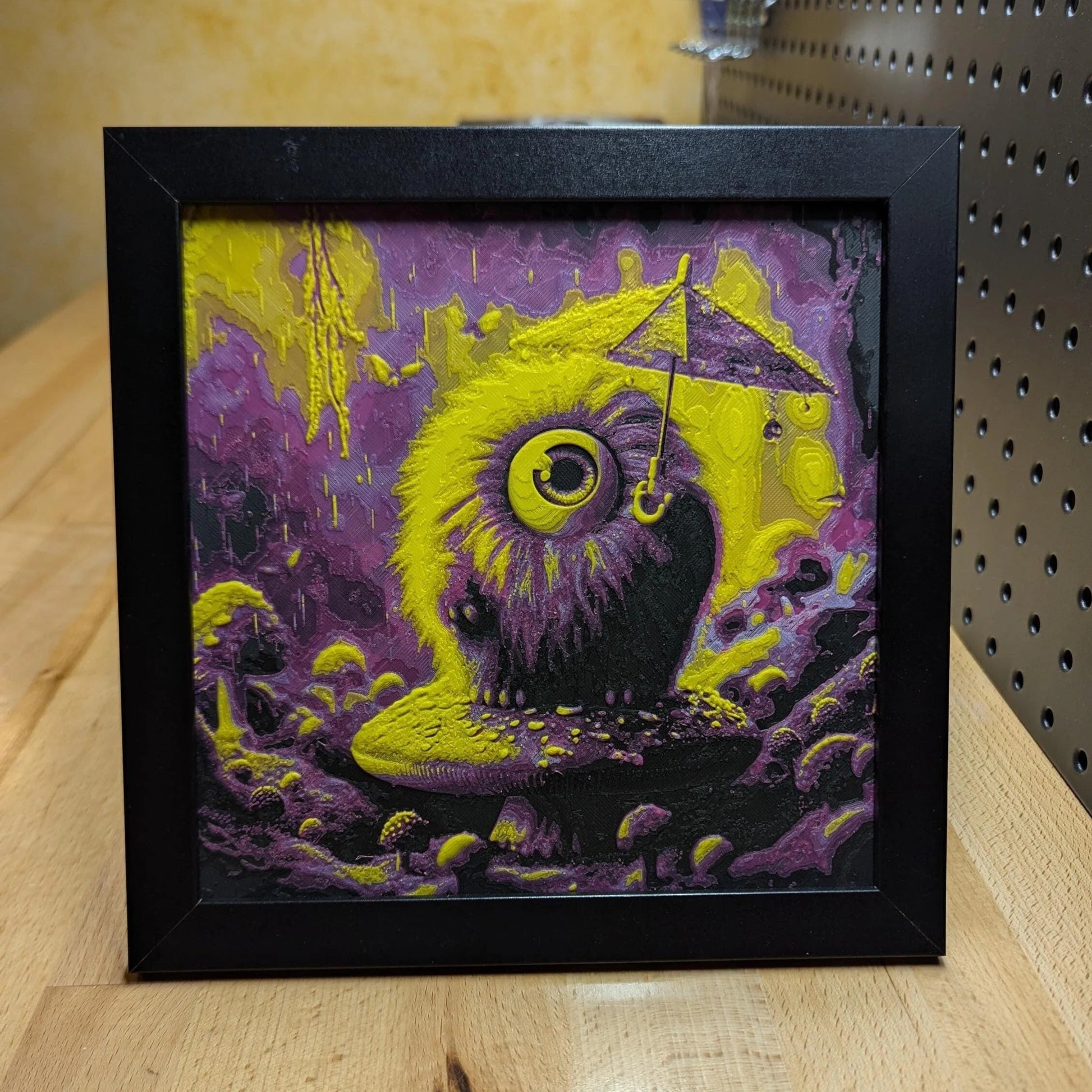Bring a touch of playful whimsy into your space with this adorable 3D printed image of a cute monster holding an umbrella. Perfect for lovers of lighthearted and fun decor, this piece captures the charm of an imaginative creature braving the rain with its trusty umbrella. The sweet and colorful design makes it a delightful addition to any room.