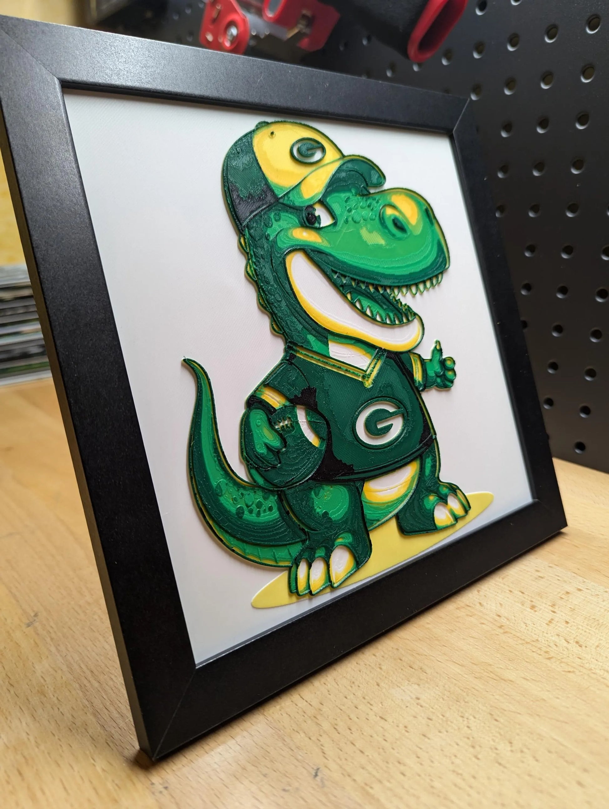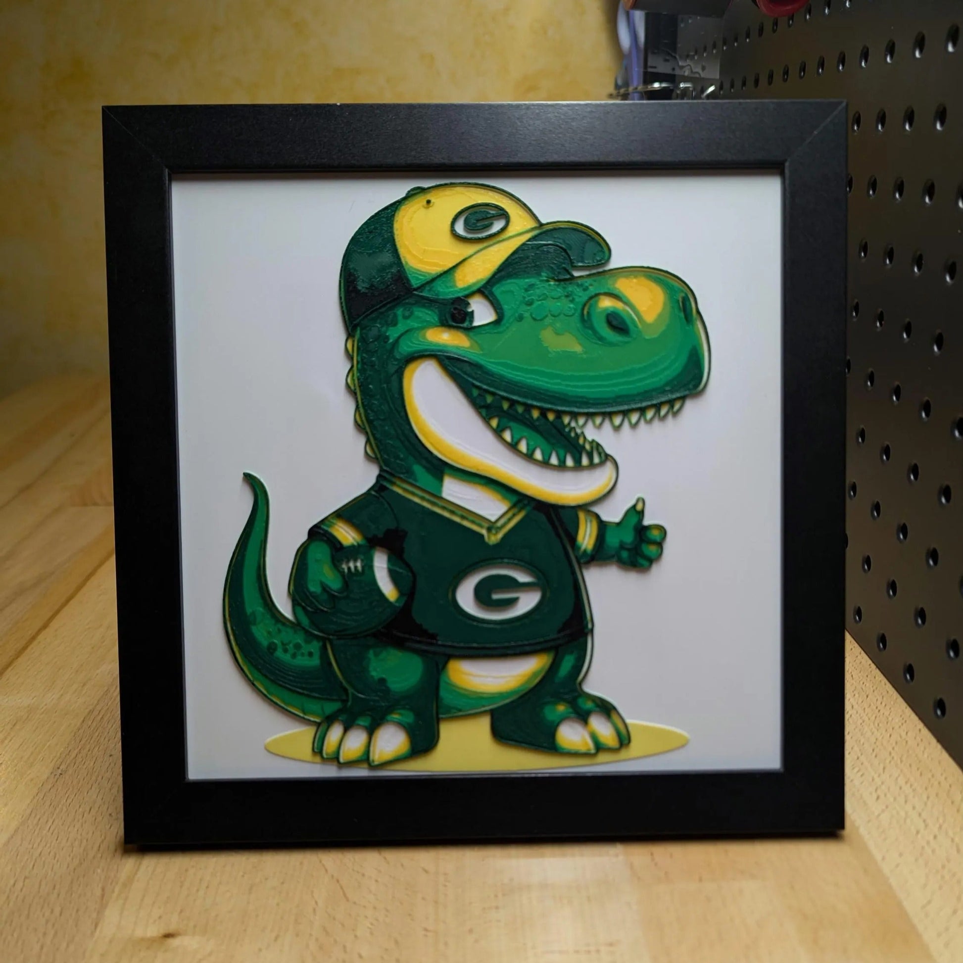 Show off your Green Bay Packers pride with a playful twist through this 3D printed image of a cartoonish Green Bay Packers Dino. Perfect for die-hard Packers fans who love a bit of fun in their decor, this piece combines the fierce energy of a dinosaur with the team spirit of the Packers, making it a delightful and unique addition to any space.