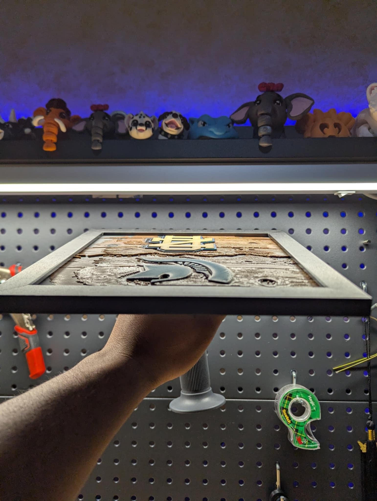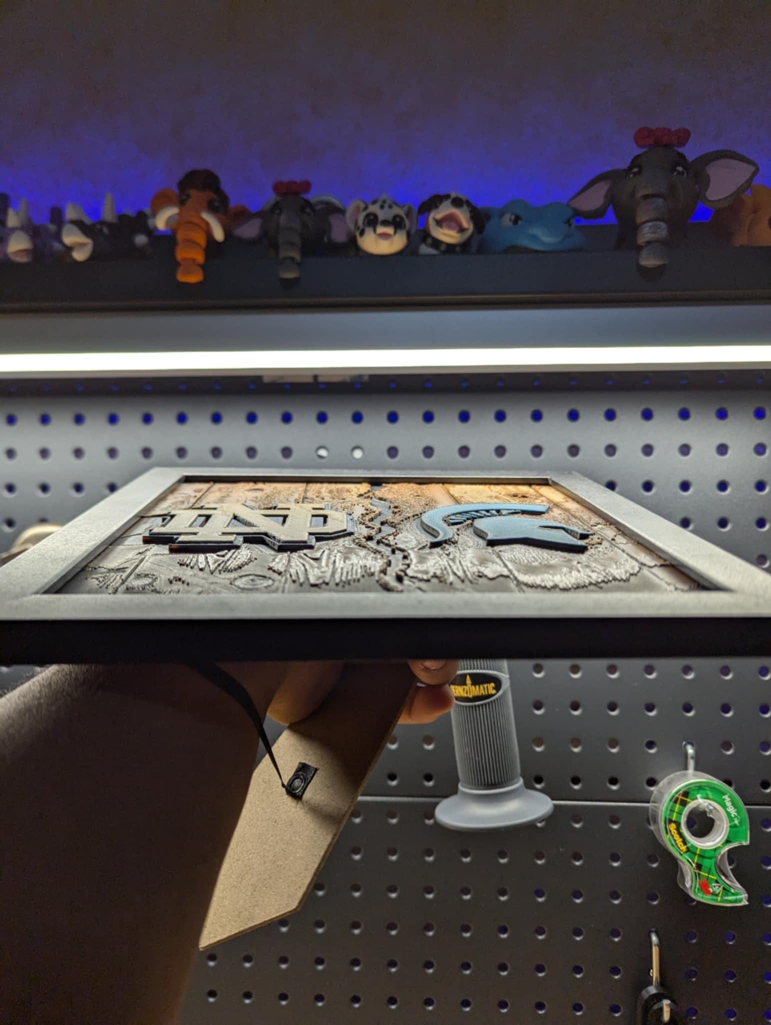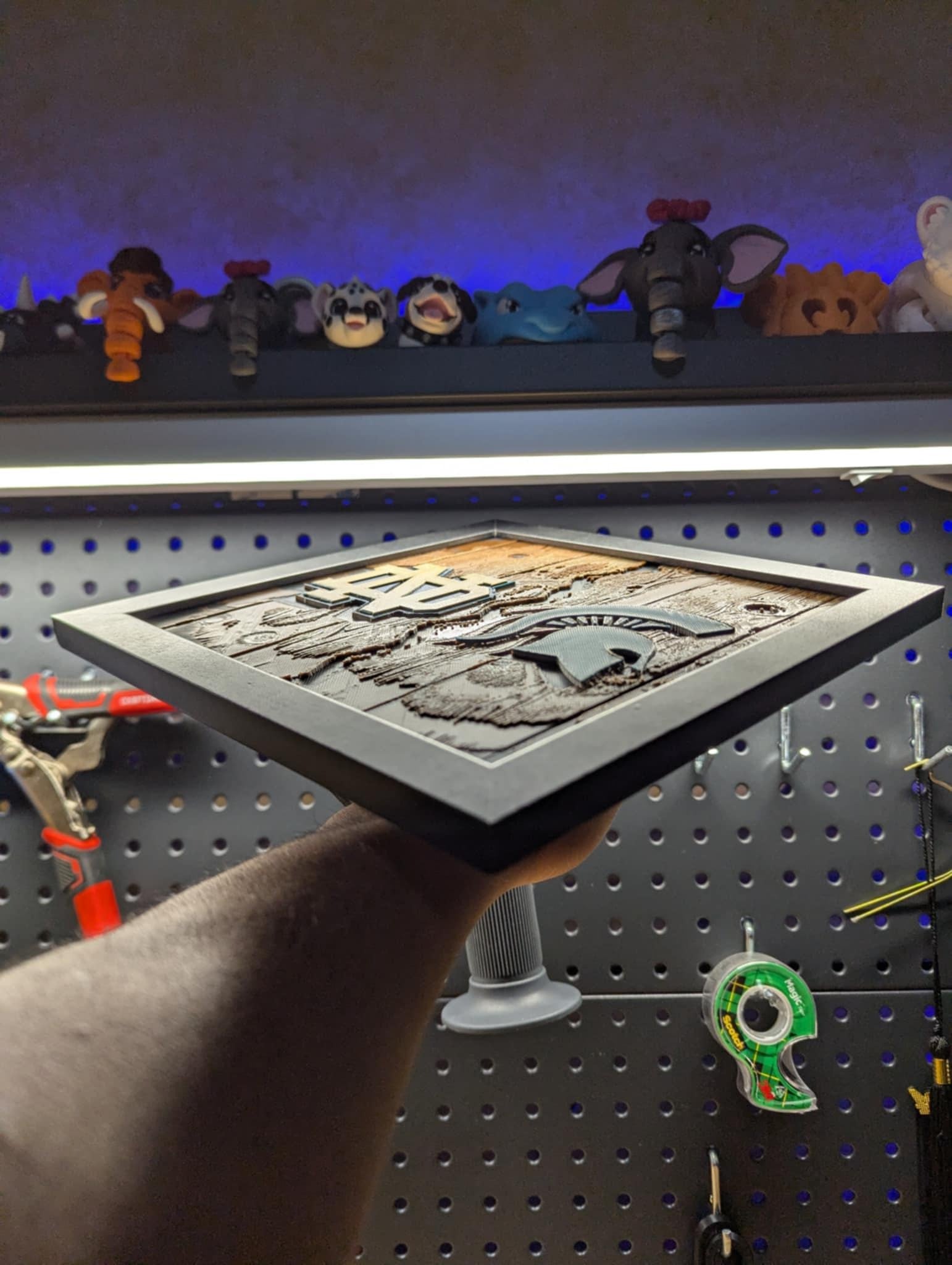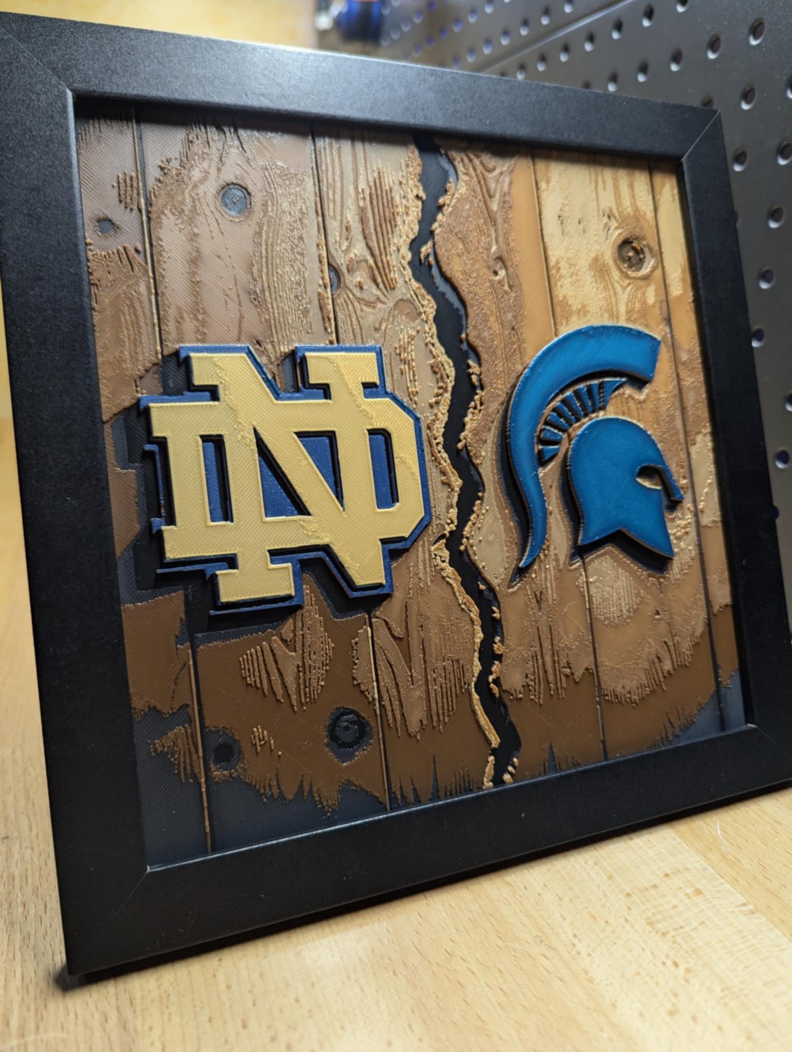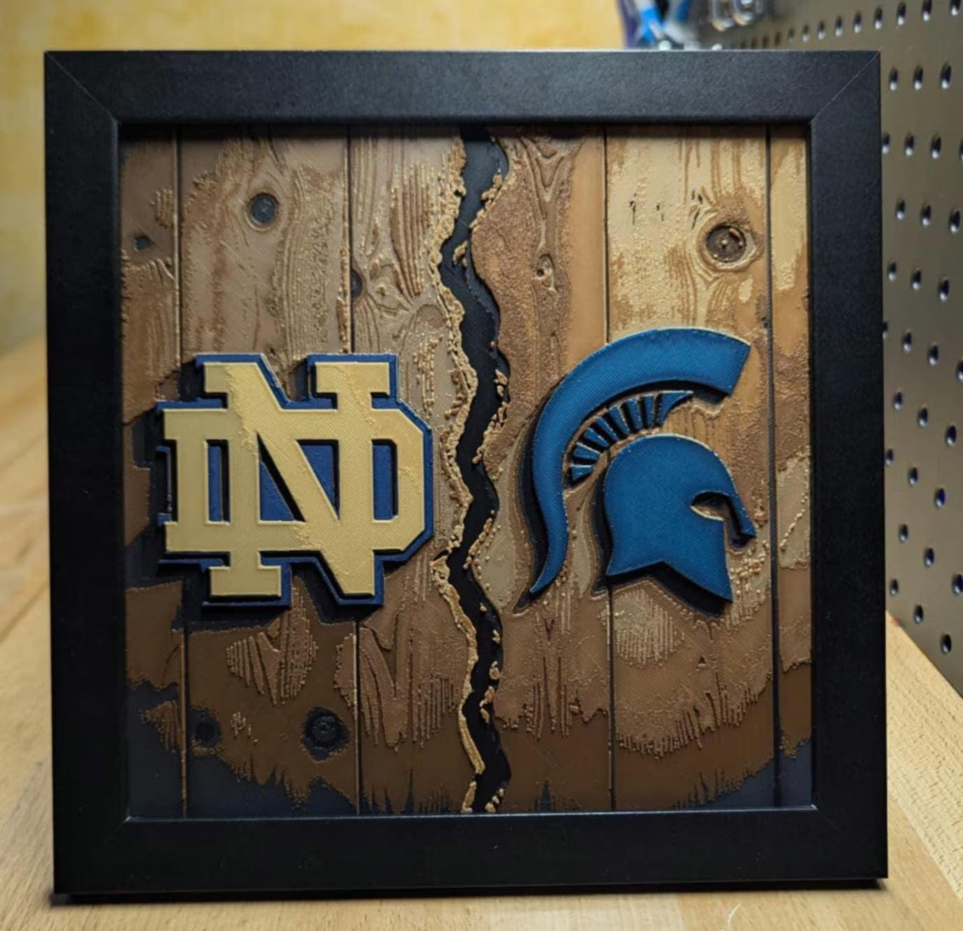 Celebrate the ultimate college football rivalry in your home with this House Divided Hueforge featuring the iconic logos of Notre Dame and Michigan State. Set against a classic wood panel background, this piece blends rustic charm with bold team pride. Each side proudly showcases its colors and emblem, creating a perfect balance for fans living under one roof—but cheering for different teams. Whether it's game day or every day, this design makes a striking addition to any fan cave, entryway, or family room.