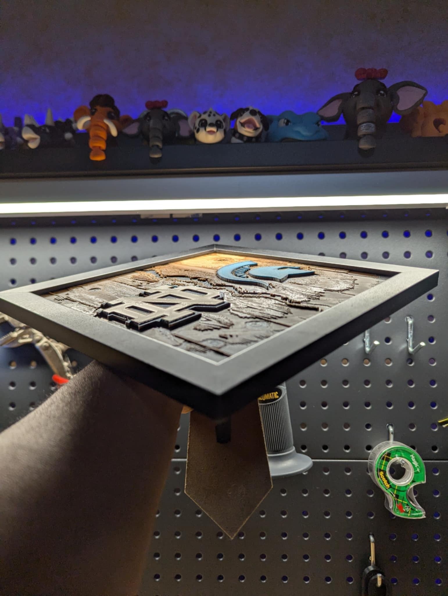 3D printed image of a Notre Dame and Michigan State house divided, with a fissure effect
