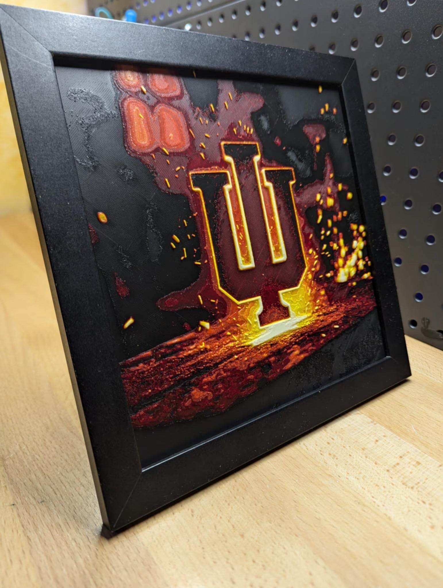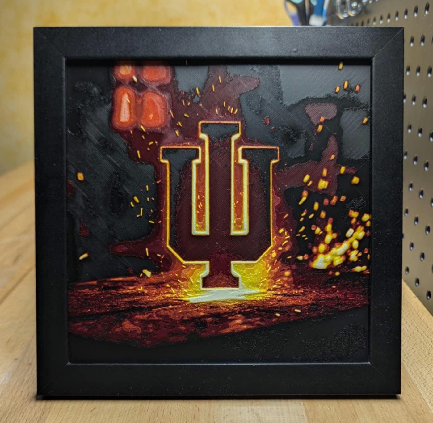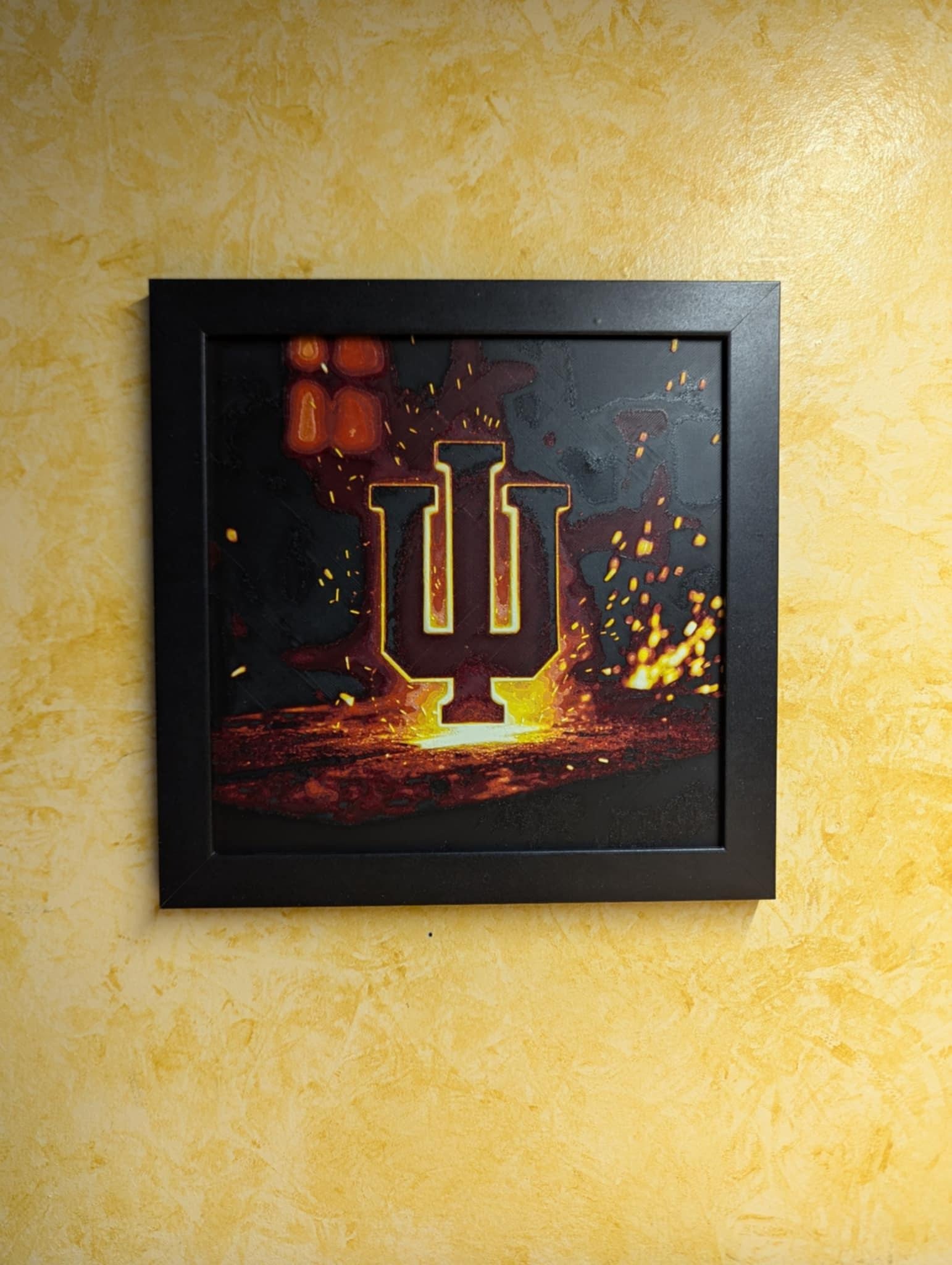 Ignite your Hoosier spirit with this striking Hueforge featuring the iconic IU logo illuminated by a blazing forged fire backdrop. The deep reds and glowing embers create an intense, fiery atmosphere that makes the logo feel like it's been tempered in passion and tradition. A perfect piece for Indiana fans who bleed crimson and crave bold, powerful wall art that commands attention.