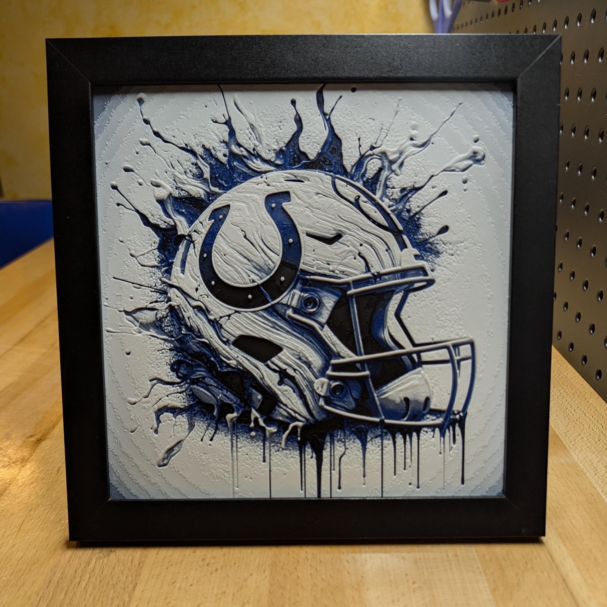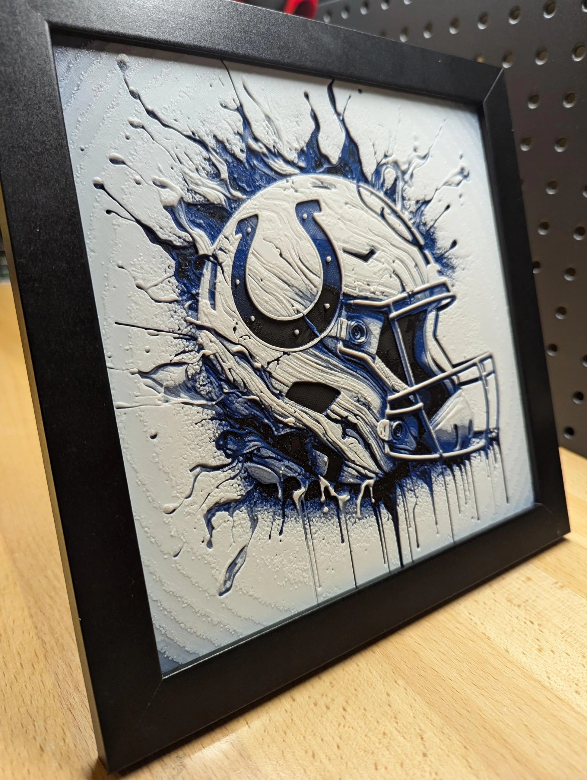Show your Indianapolis Colts pride with this dynamic 3D printed image of the Colts helmet, featuring a bold paint splatter effect. Perfect for fans who want to add an energetic and artistic touch to their game day decor, this piece captures the excitement of the team with a unique and colorful design. The paint splatter effect adds a sense of motion and intensity, making it a standout addition to any fan’s collection.