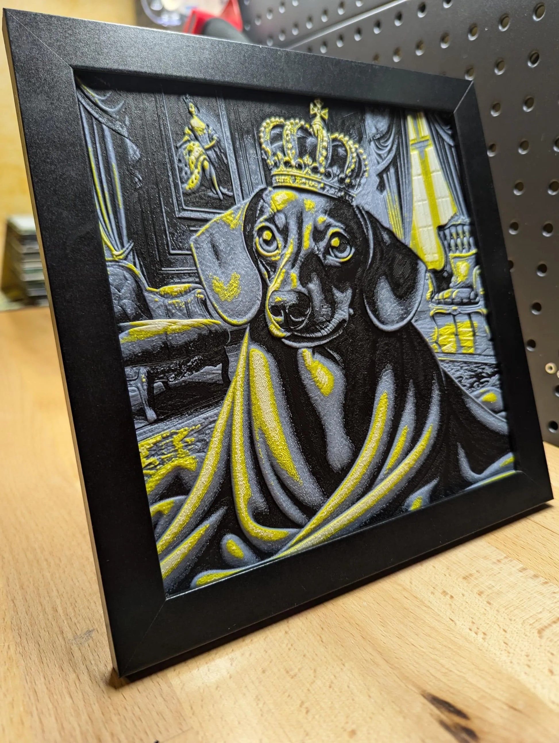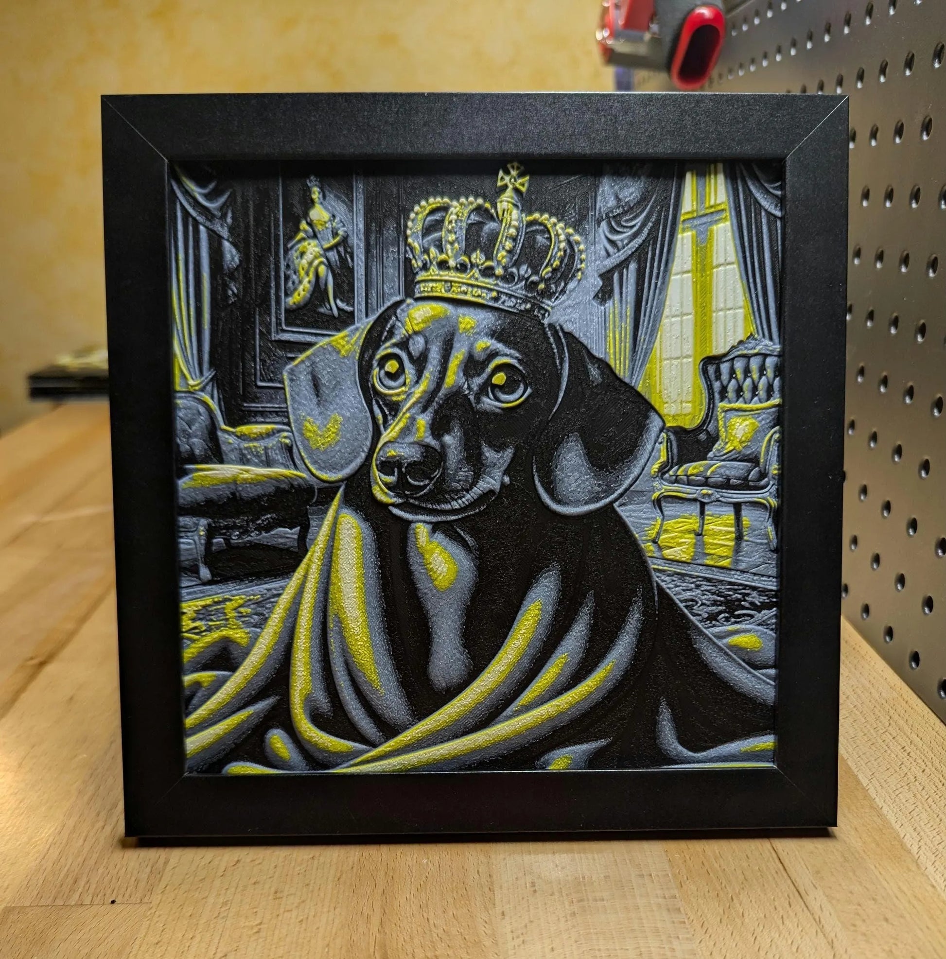 Celebrate the charm and majesty of your favorite little king with this adorable 3D printed image of a Dachshund dressed in a regal cloak and wearing a king's hat. Perfect for Dachshund lovers and those who appreciate a touch of humor in their decor, this piece captures the playful and dignified spirit of a royal pup. The detailed design adds a whimsical and delightful touch to any space.