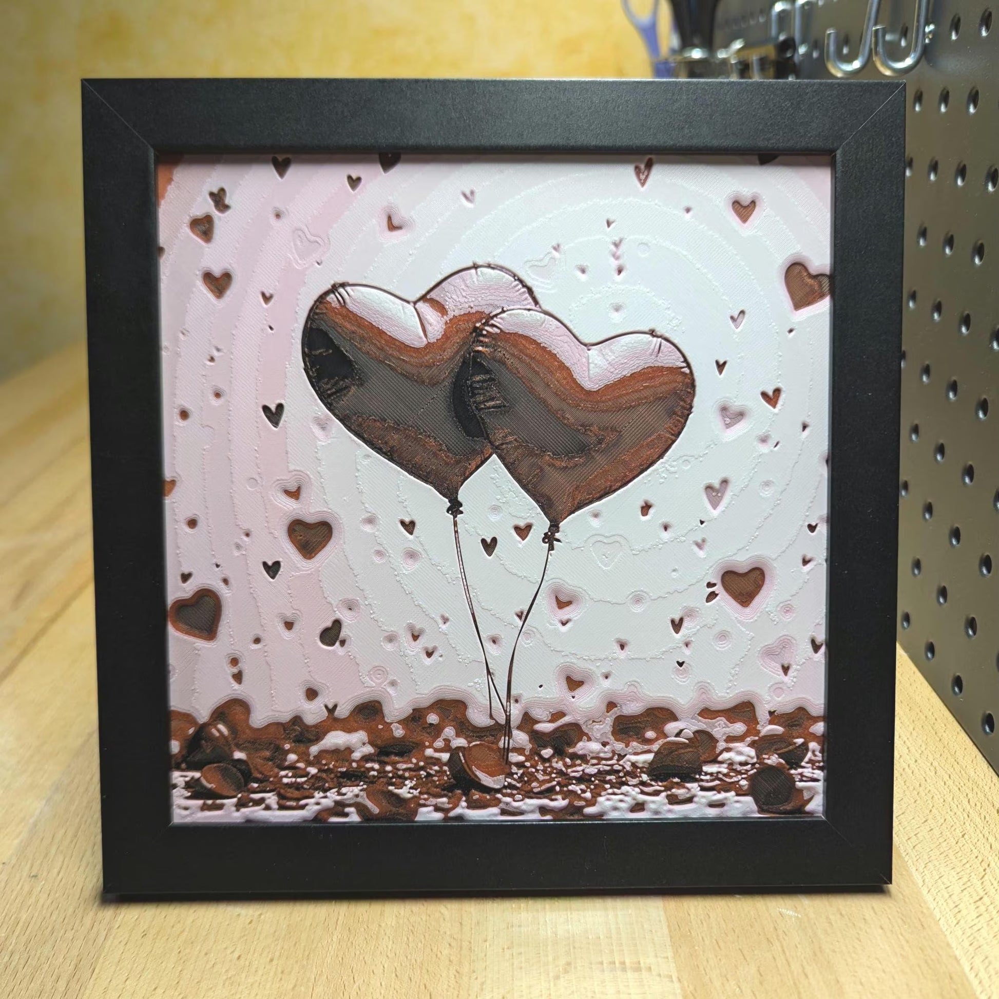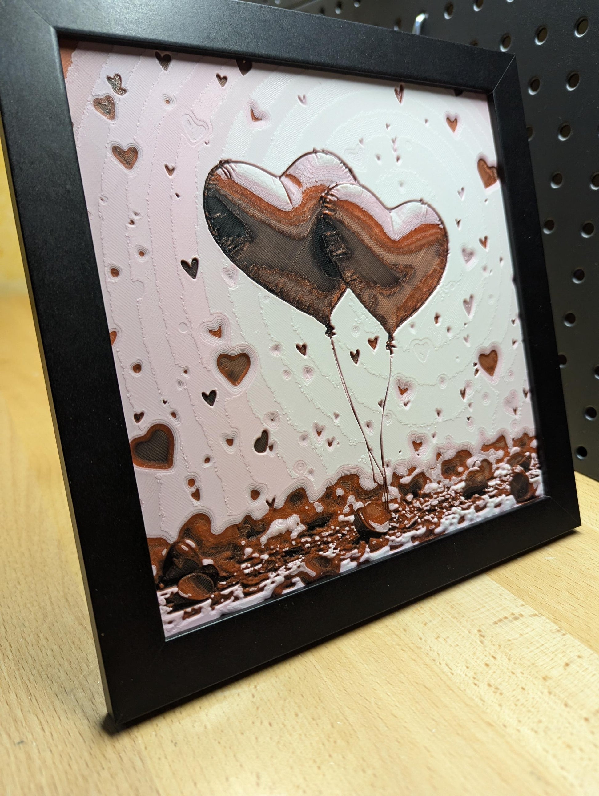 A dreamy, romantic Hueforge featuring heart-shaped balloons floating gracefully against a soft, heart-filled background. The warm, glowing hues create an atmosphere of love and joy, making this piece perfect for Valentine's Day, anniversaries, or anyone who wants to surround themselves with a little extra love. Let this heartwarming design add a touch of whimsy and affection to your collection!