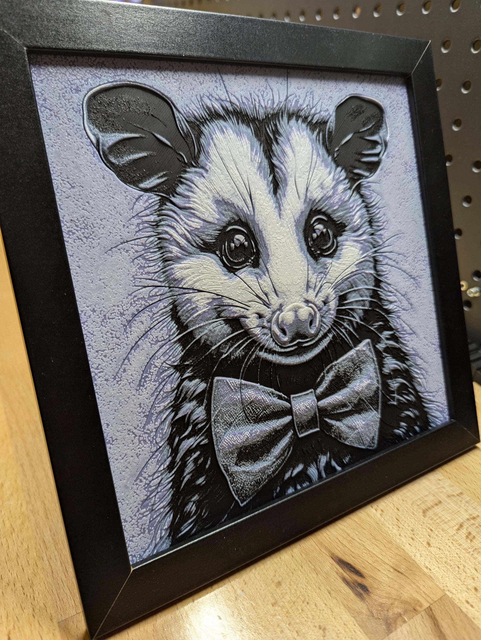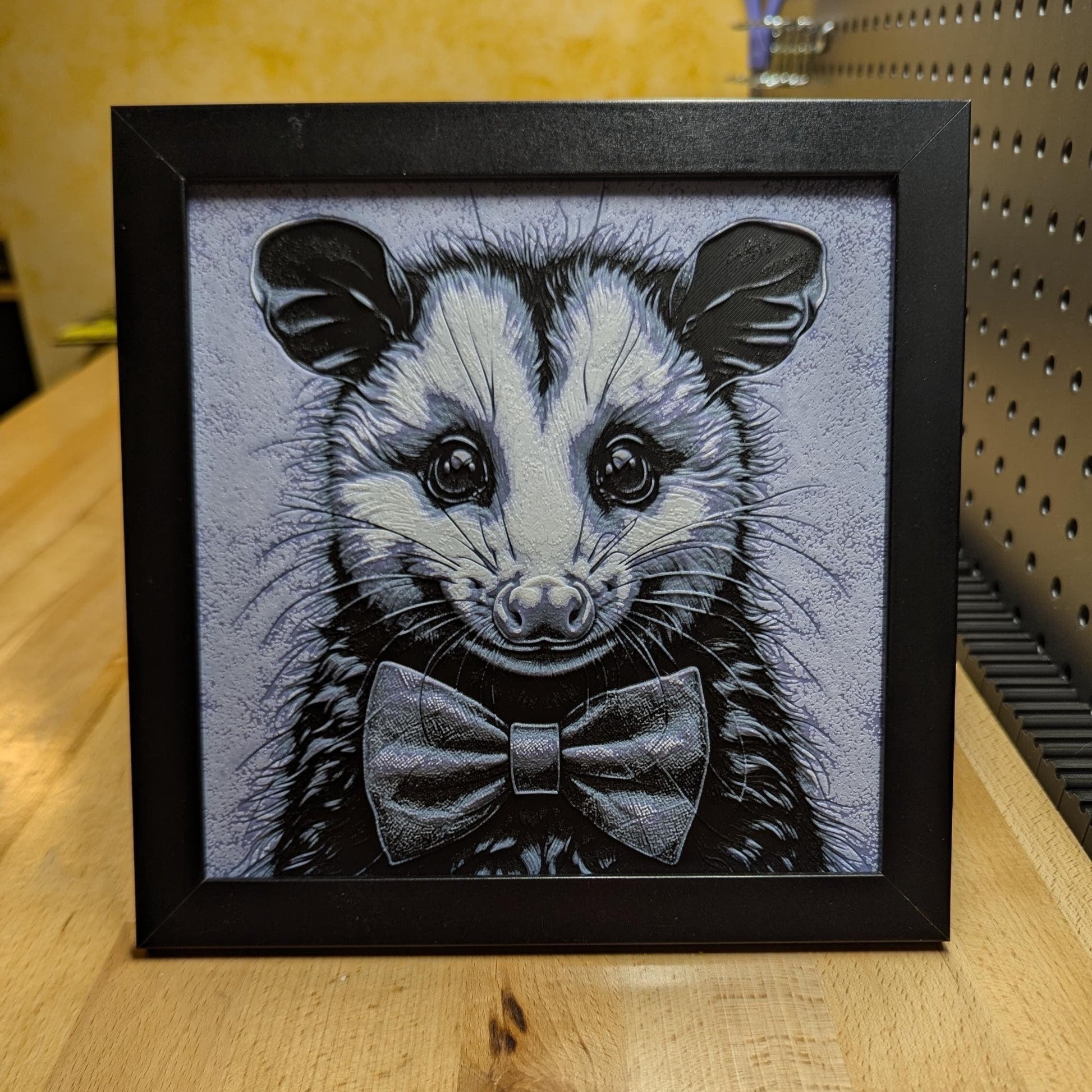 Add a touch of adorable charm to your space with this 3D printed image of a cute opossum. Perfect for animal lovers and fans of quirky wildlife, this piece captures the sweet and curious expression of a friendly opossum, making it a heartwarming addition to any room. The detailed design highlights the lovable nature of this often-overlooked creature, adding a unique and delightful touch to your decor.