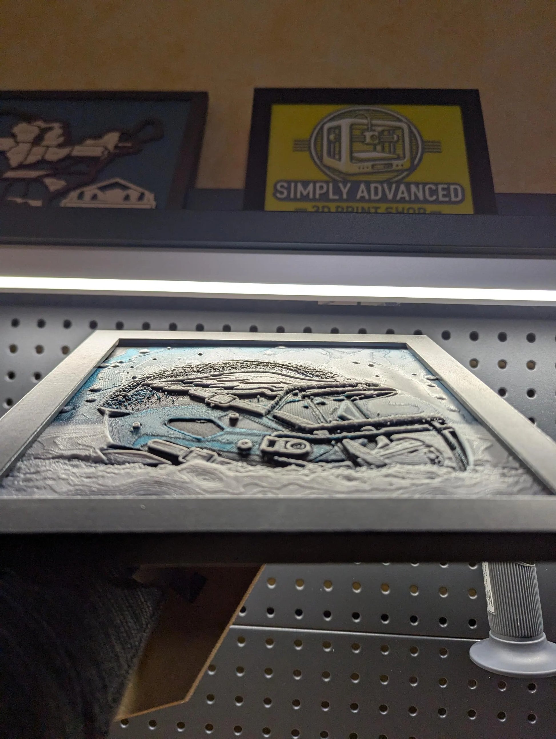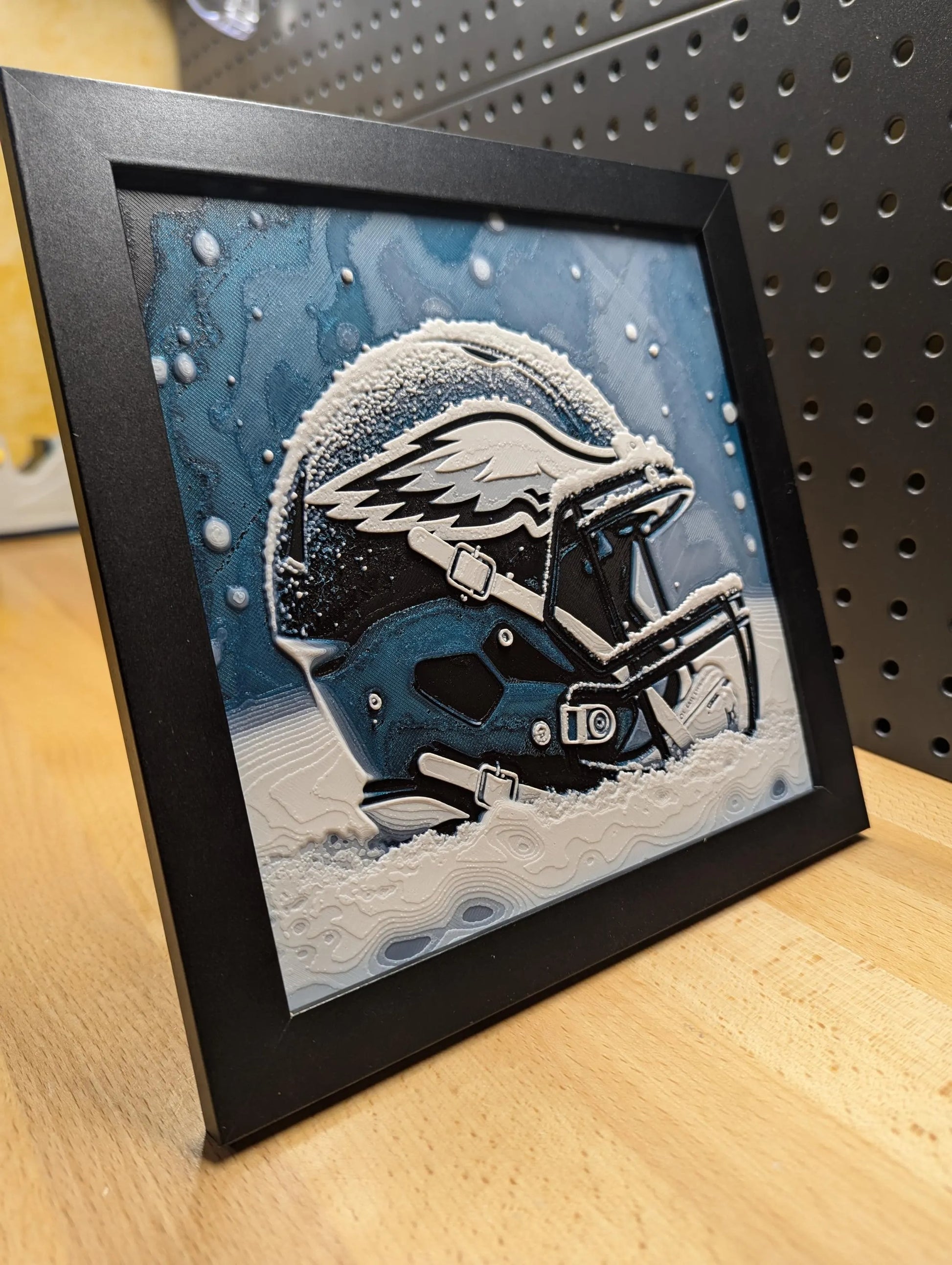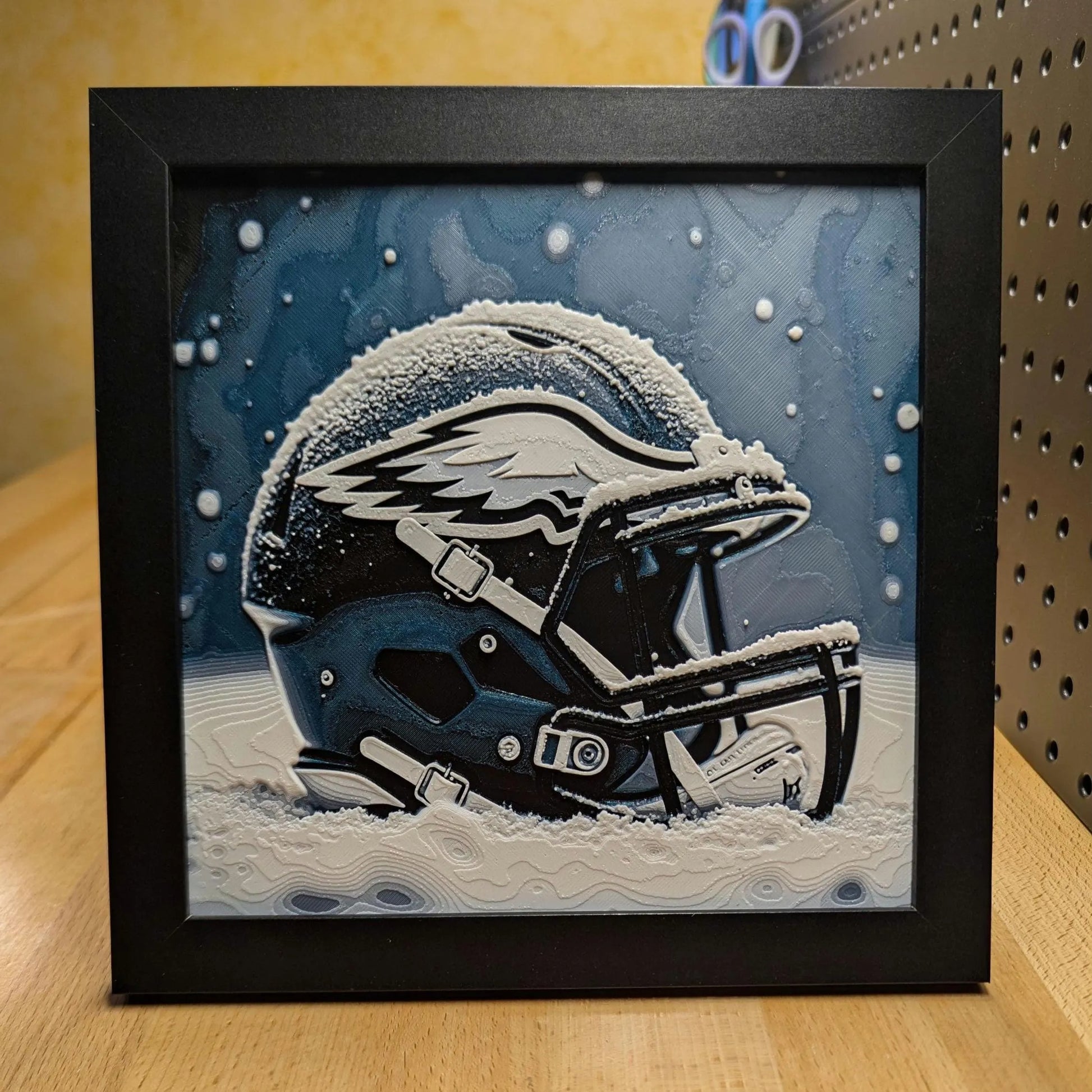 Celebrate your love for the Philadelphia Eagles with this unique 3D printed image featuring their iconic helmet resting in a snowy scene. Perfect for dedicated fans of the Birds, this piece combines the toughness of the Eagles with the serene beauty of a winter setting. The detailed design highlights the helmet’s sleek look, surrounded by the soft texture of snow, making it a standout addition to your decor.