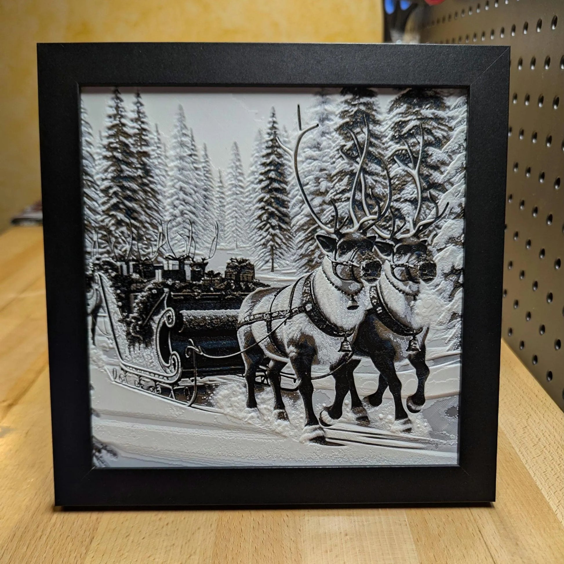 Capture the timeless charm of the holiday season with this enchanting 3D printed image of reindeer pulling a sleigh. Perfect for creating a festive atmosphere, this piece brings the magic of Christmas to life with its detailed design and classic holiday imagery. The intricate craftsmanship showcases the elegance of the reindeer in motion, pulling a beautifully designed sleigh, making it a delightful addition to any decor.