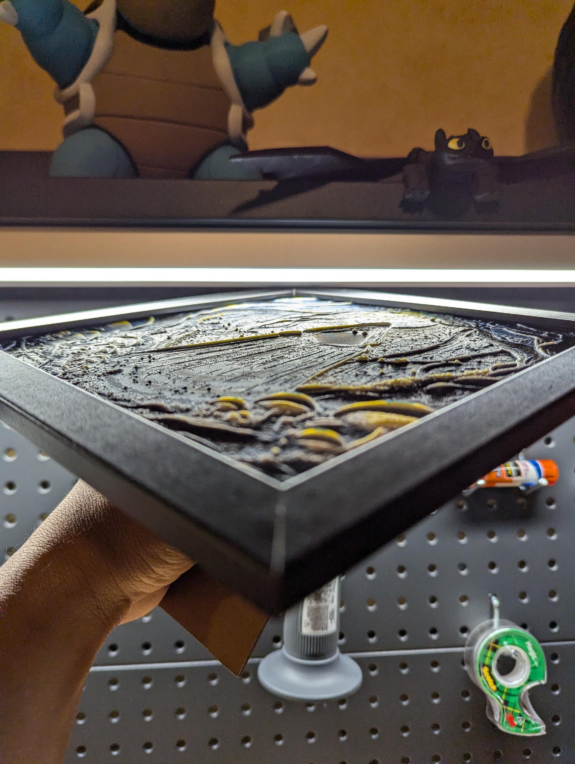 3D printed image of a shadowy figure walking through the woods with mushrooms