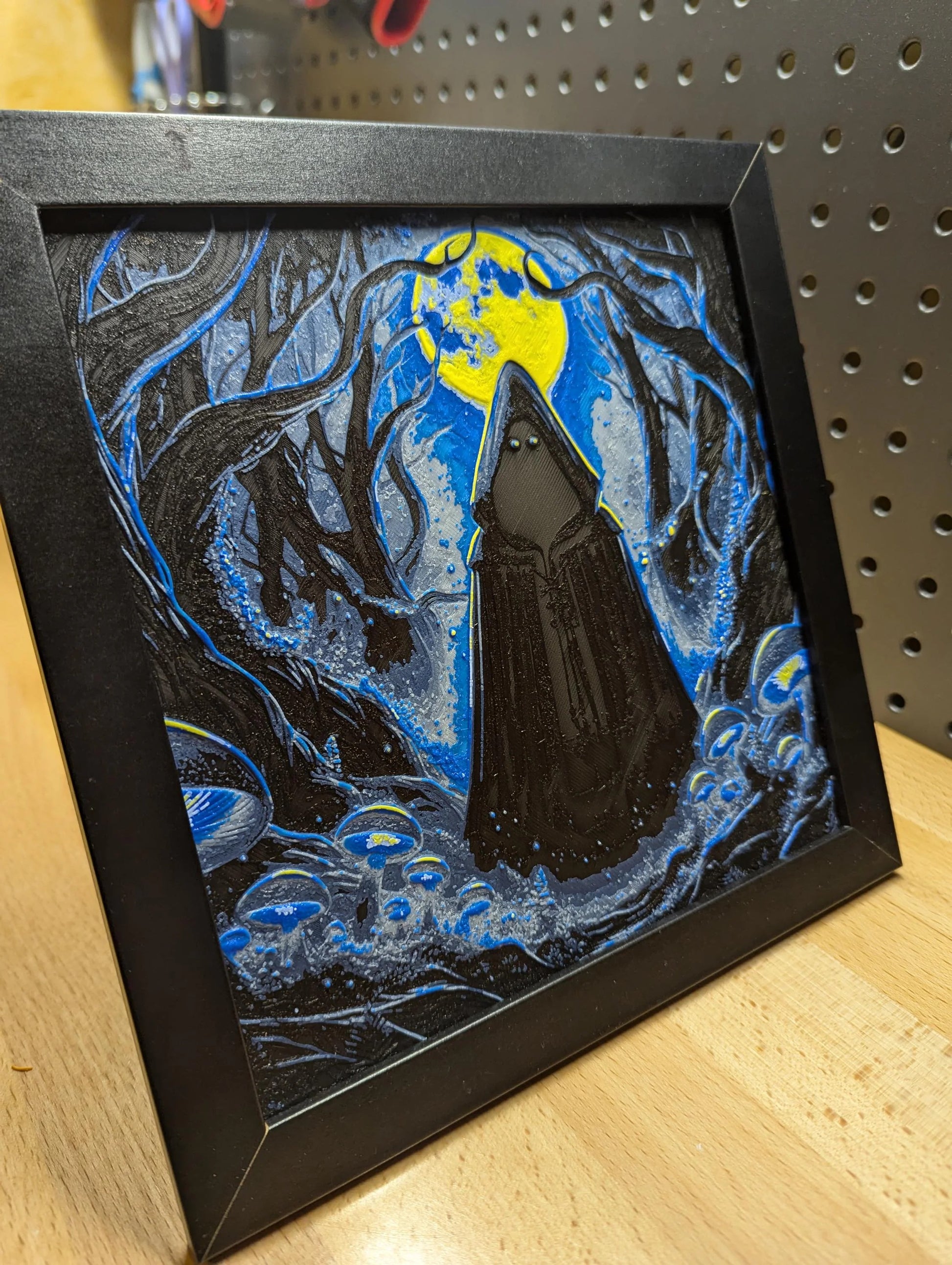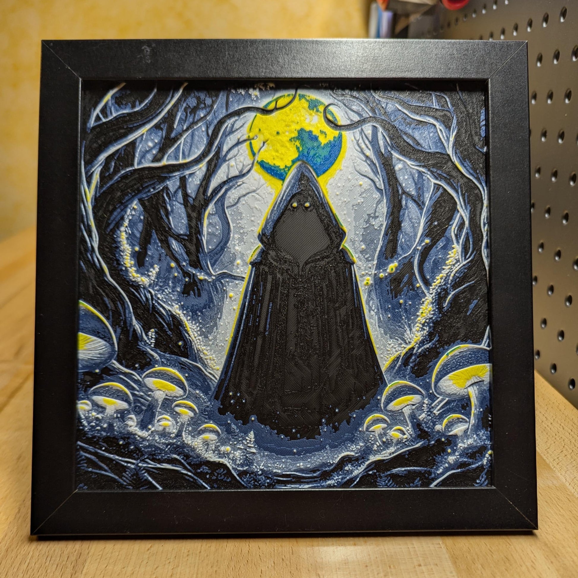 Step into an eerie and mysterious world with this 3D printed image of a shadowy figure walking through the woods, surrounded by mushrooms. Perfect for lovers of the mysterious and the supernatural, this piece captures the haunting beauty of a dark forest scene where the unknown lurks. The surreal design adds a sense of suspense and wonder to any space.