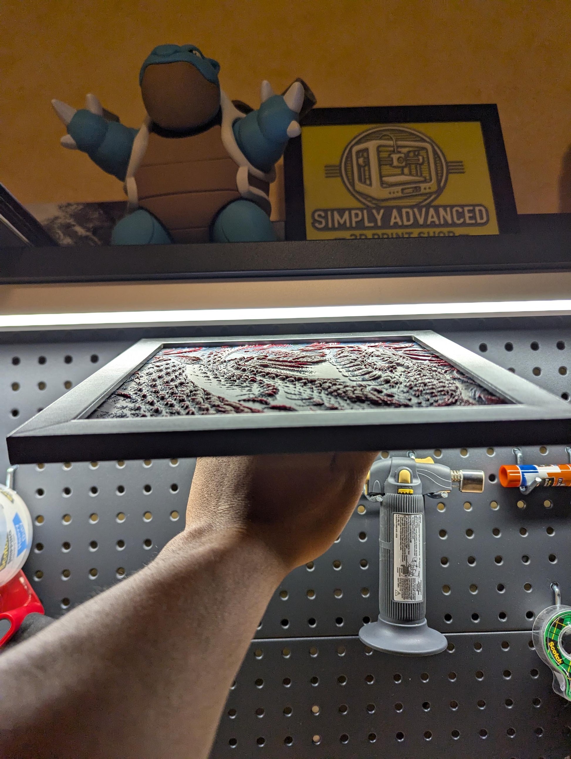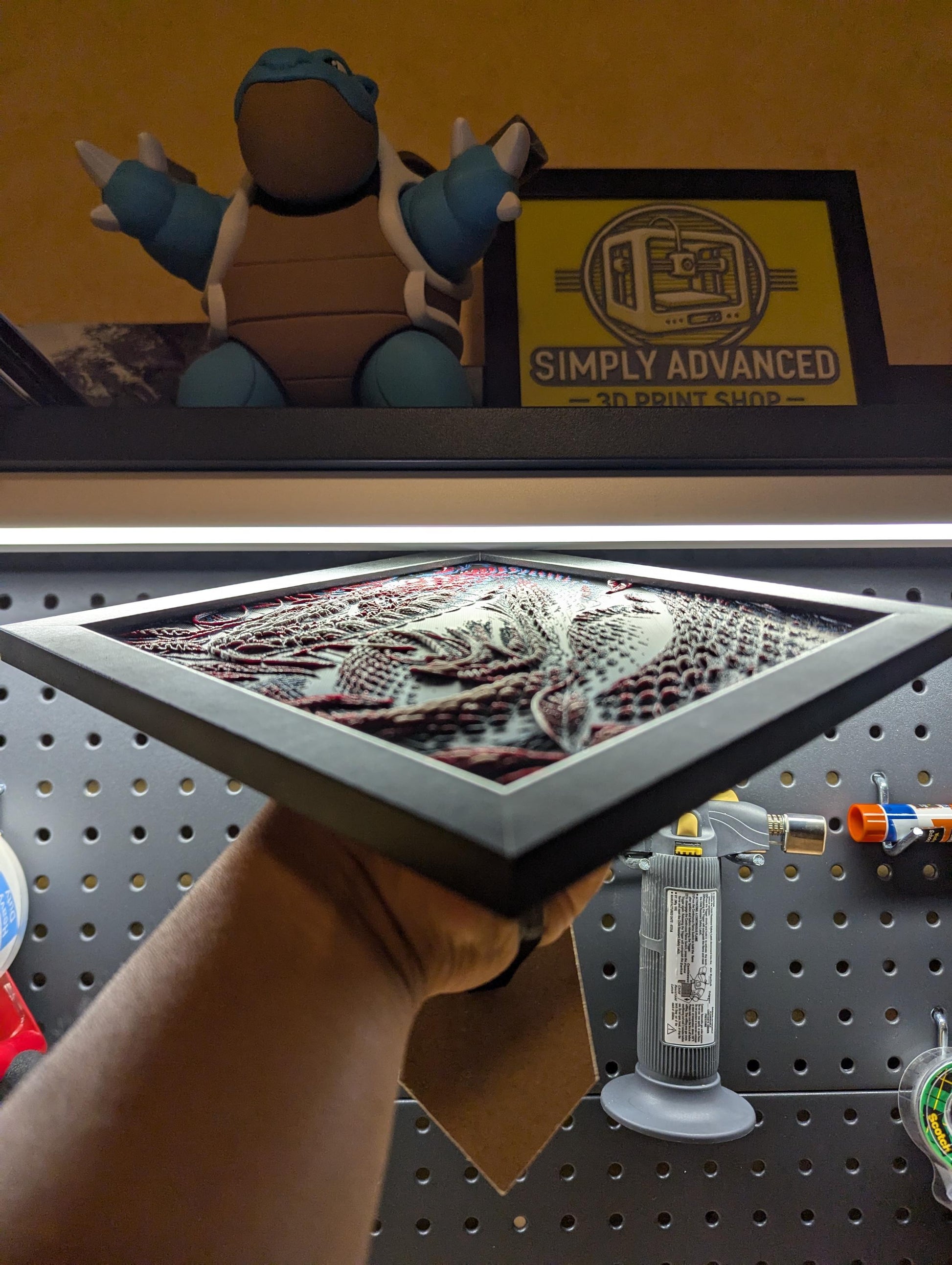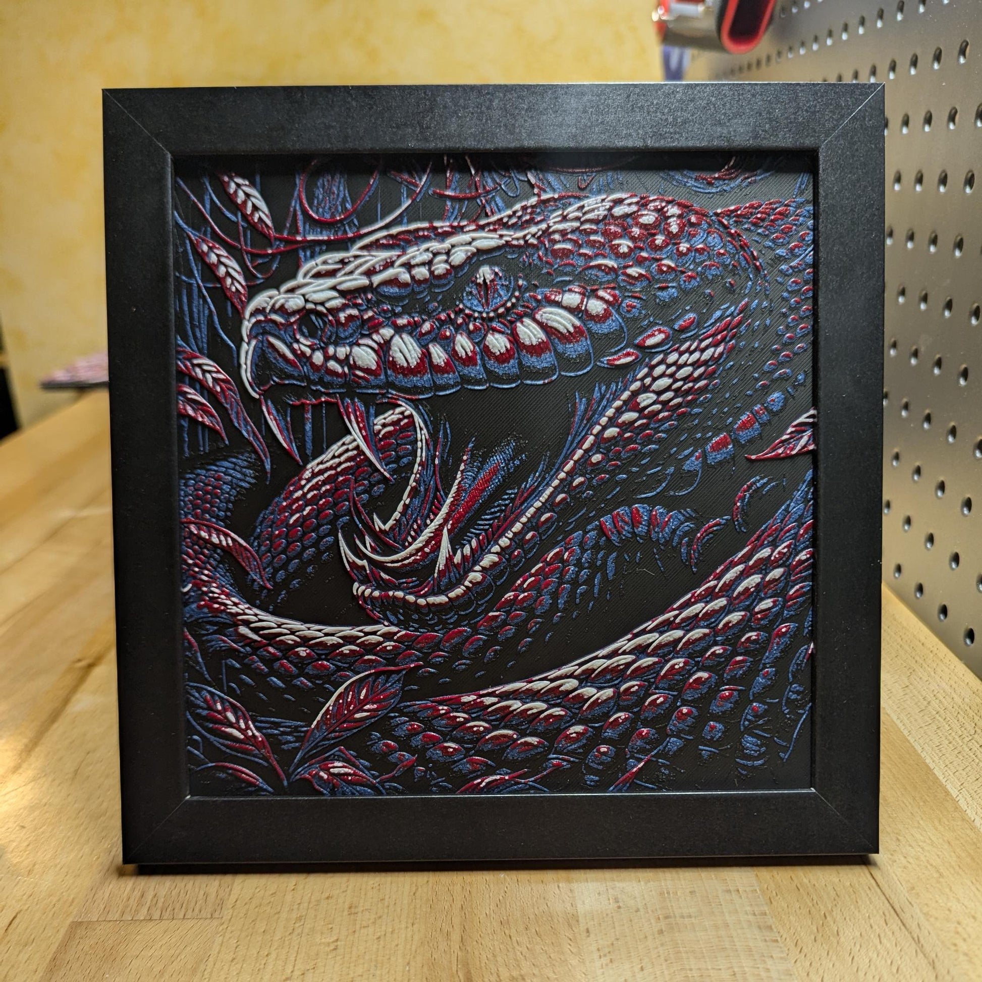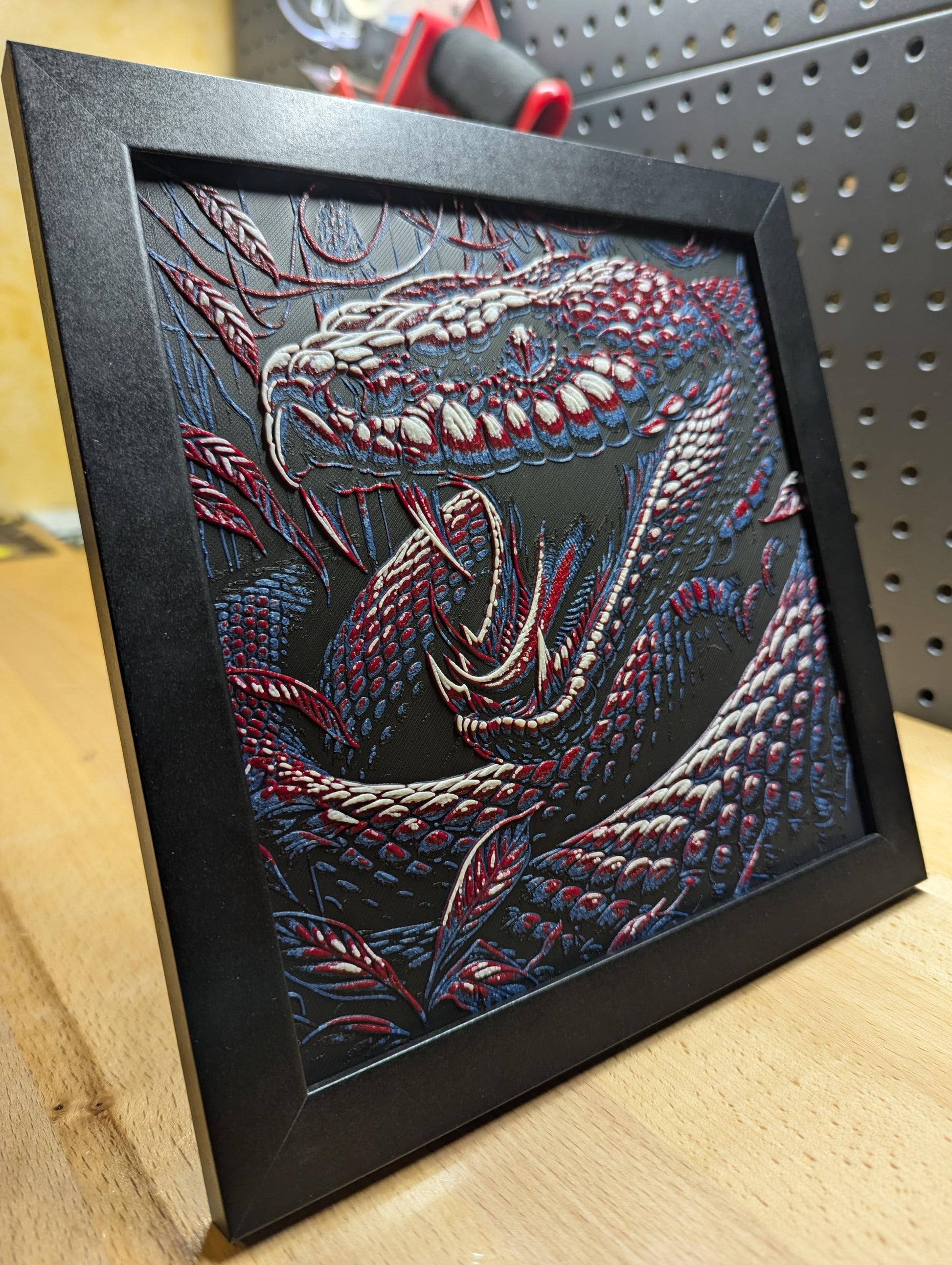 Bring the intrigue and beauty of the wild into your space with this stunning 3D printed close-up image of a snake's head. Perfect for reptile enthusiasts and admirers of nature's detail, this piece captures the striking patterns and piercing gaze of a snake, showcasing its fascinating texture and elegance. The detailed design adds a bold and captivating element to any decor.