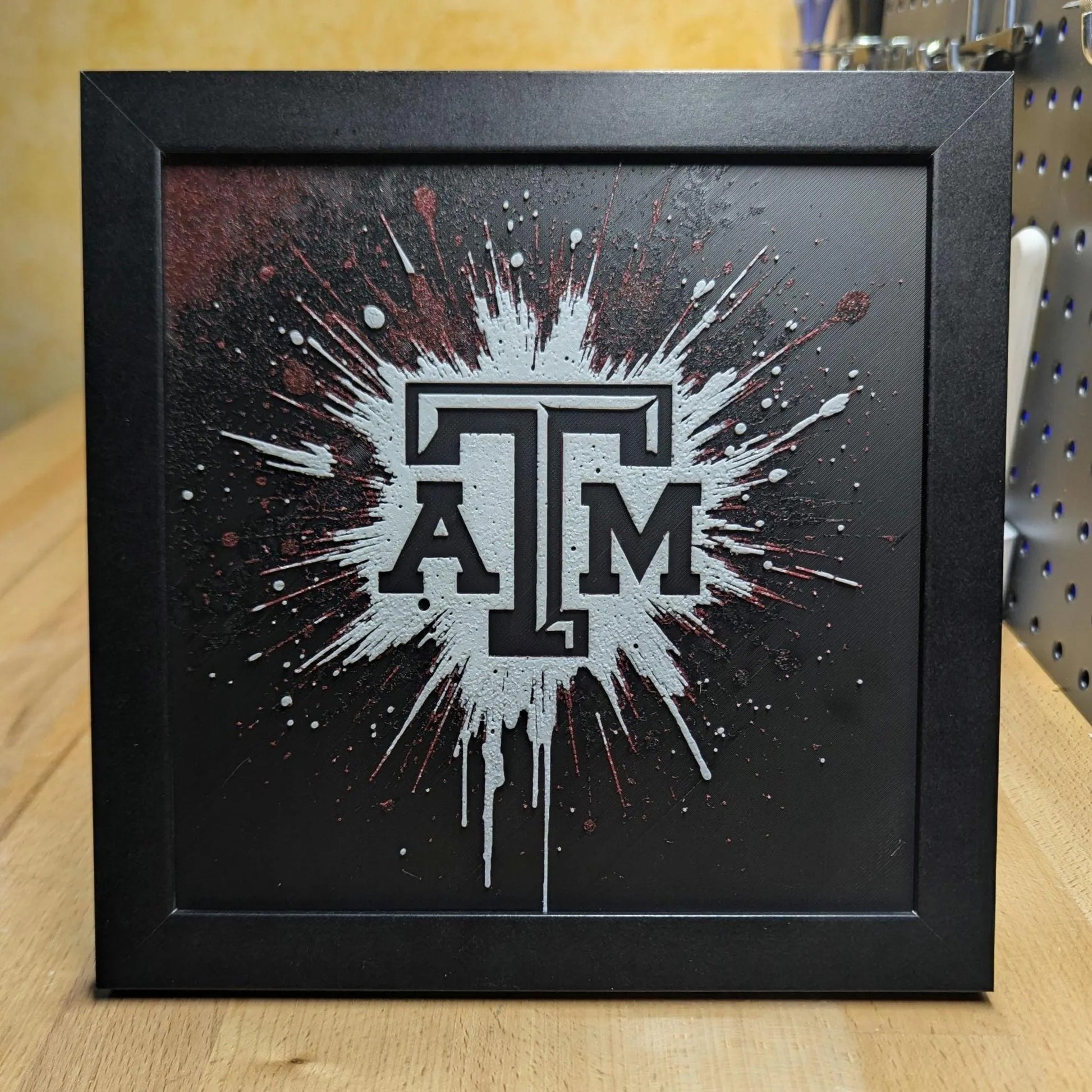 Show off your Aggie pride with this bold and eye-catching 3D printed Texas A&M image, featuring the iconic “ATM” logo brought to life with a dynamic paint splatter effect. Whether you're a student, alumni, or a die-hard fan, this piece makes a powerful statement with its energetic design and layered 3D texture. The paint splatter background gives it a gritty, modern edge—perfect for game rooms, dorms, offices, or any space where Texas A&M spirit is celebrated. It’s more than just wall art; it’s a vibrant tribute to the passion and pride that defines the Aggie community.